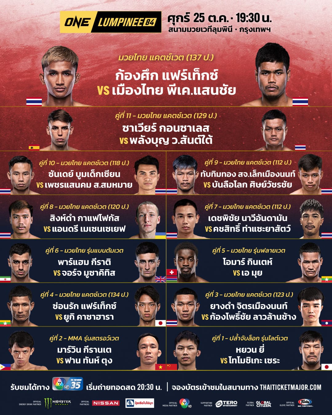 โปรแกรมมวย ONE ลุมพินี 84 คู่เอกนำรายการ “ก้องศึก แฟร์เท็กซ์” จอมบู๊ไอคิวดี วัย 24 ปี จากเมืองย่าโมโคราช ขอท้าทายอำนาจแกร่ง “ขุนศอกผีดิบ” เมืองไทย พีเค.แสนชัย รุ่นพี่จอมอึด วัย 30 ปี จากบุรีรัมย์ ที่พกประสบการณ์มาเต็มกระเป๋า ในกติกามวยไทย พิกัดเฉพาะ (แคตช์เวต) 137 ป.