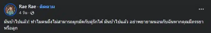 ย้อนกลับไปก่อนหน้านี้ Rae Lil Black หรือ เร เรวดี นักแสดงหนังผู้ใหญ่ ที่ในช่วงหลังเธอปรากฎตัวที่ประเทศไทยมากขึ้น และยังเป็นแฟนตัวยงของกีฬามวยไทย ได้โพสตืข้อความผ่านแฟนเพจภาษาไทย Rae Rae เอาไว้ว่า “มันบ้าไปแล้ว! ทำไมคนถึงไม่สามารถผูกมัดกับคู่รักได้ มันบ้าไปแล้ว อย่าพยายามนอนกับฉันหากคุณมีภรรยาหรือลูก”