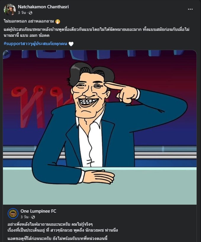 ล่าสุด นัท วันเดอร์เกิร์ล นักชกสาวชาวไทย ได้โพสต์ข้อความผ่านเฟซบุ๊ก Natchakamon Chanthasri ในทำนองว่าในตอนนี้เธอรู้แล้วว่านักมวยคนนั้นคือใคร ความว่า “ขนาดนักมวยที่ค่าตัวตอนนี้เยอะสุดๆ ก็ยังทำเลย หน้าเฟสไลฟ์สดบอกรักลูก รักเมีย แต่หลังไมค์มาขอไลน์ผญไปทั่ว” แต่สุดท้ายโพสต์ดังกล่าวก็ถูกลบออกไป