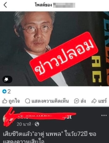 ทำเอาแฟน ๆ จำนวนมากอกสั่นขวัญเสียกันไปหมด หลังมีผู้ใช้เฟซบุ๊กรายหนึ่งออกมาโพสต์ภาพของนักแสดงรุ่นใหญ่ และผู้กำกับ-ผู้จัดฝีมือดี อย่าง ตู่ นพพล โกมารชุน เสียชีวิตแล้ว