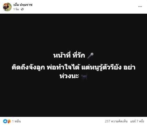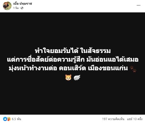 โพสต์ต่อมานักร้องหนุ่มยังคงทำใจไม่ได้ที่สูญเสียลูกแมวที่เลี้ยงไว้เร็วเกินไป แต่ก็ต้องทำใจยอมรับให้ได้ตามสัจธรรม เพราะต้องทำงาน “ทำใจยอมรับได้ ในสัจธรรม แต่การซื่อสัตย์ต่อความรู้สึก มันอ่อนแอได้เสมอ มุ่งหน้าทำงานต่อ คอนเสิร์ต เมืองขอนแก่น” และอีกโพสต์หนึ่งระบุว่า “หน้าที่ ที่รัก คิดถึงจังลูก พ่อทำใจได้ แต่หนูรู้ตัวรึยัง อย่าห่วงนะ”