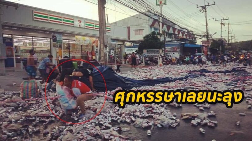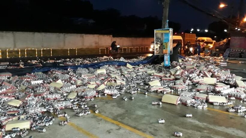 เทกระจาด! รถขนเบียร์คว่ำ ป๋องเบียร์กระจายเต็มถนน ชาวบ้านช่วยเก็บ(ใส่กระเป๋า)