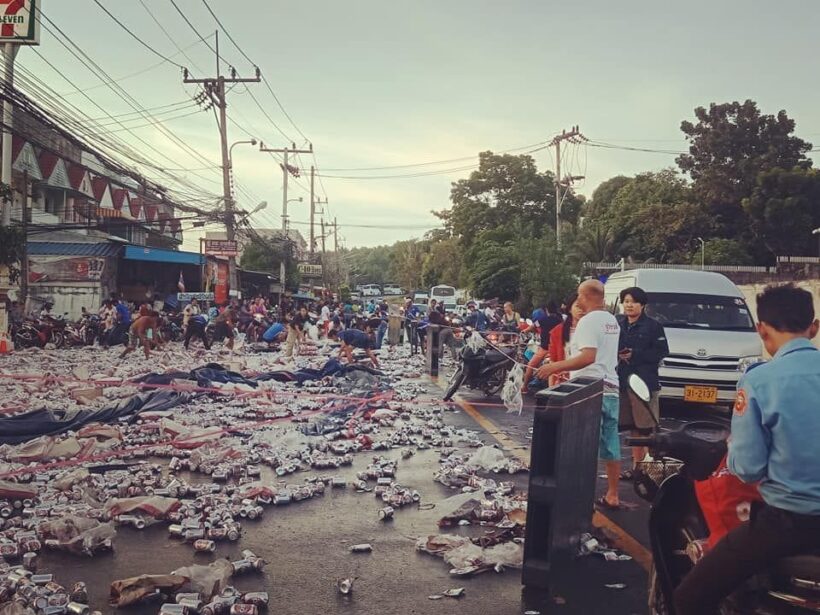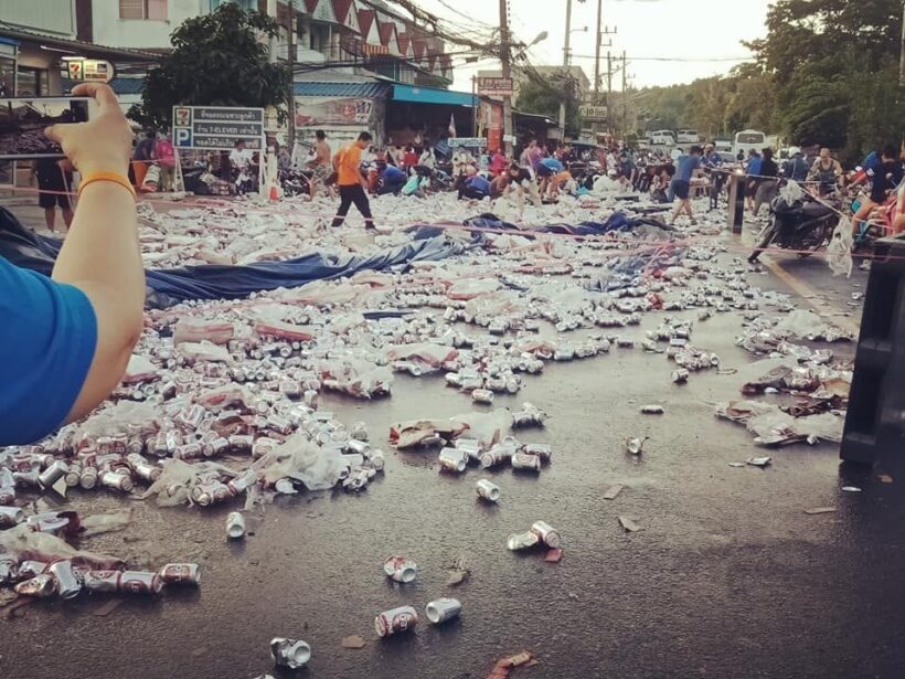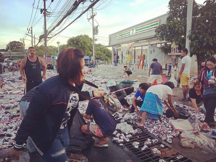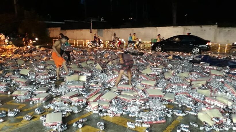 เทกระจาด! รถขนเบียร์คว่ำ ป๋องเบียร์กระจายเต็มถนน ชาวบ้านช่วยเก็บ(ใส่กระเป๋า)