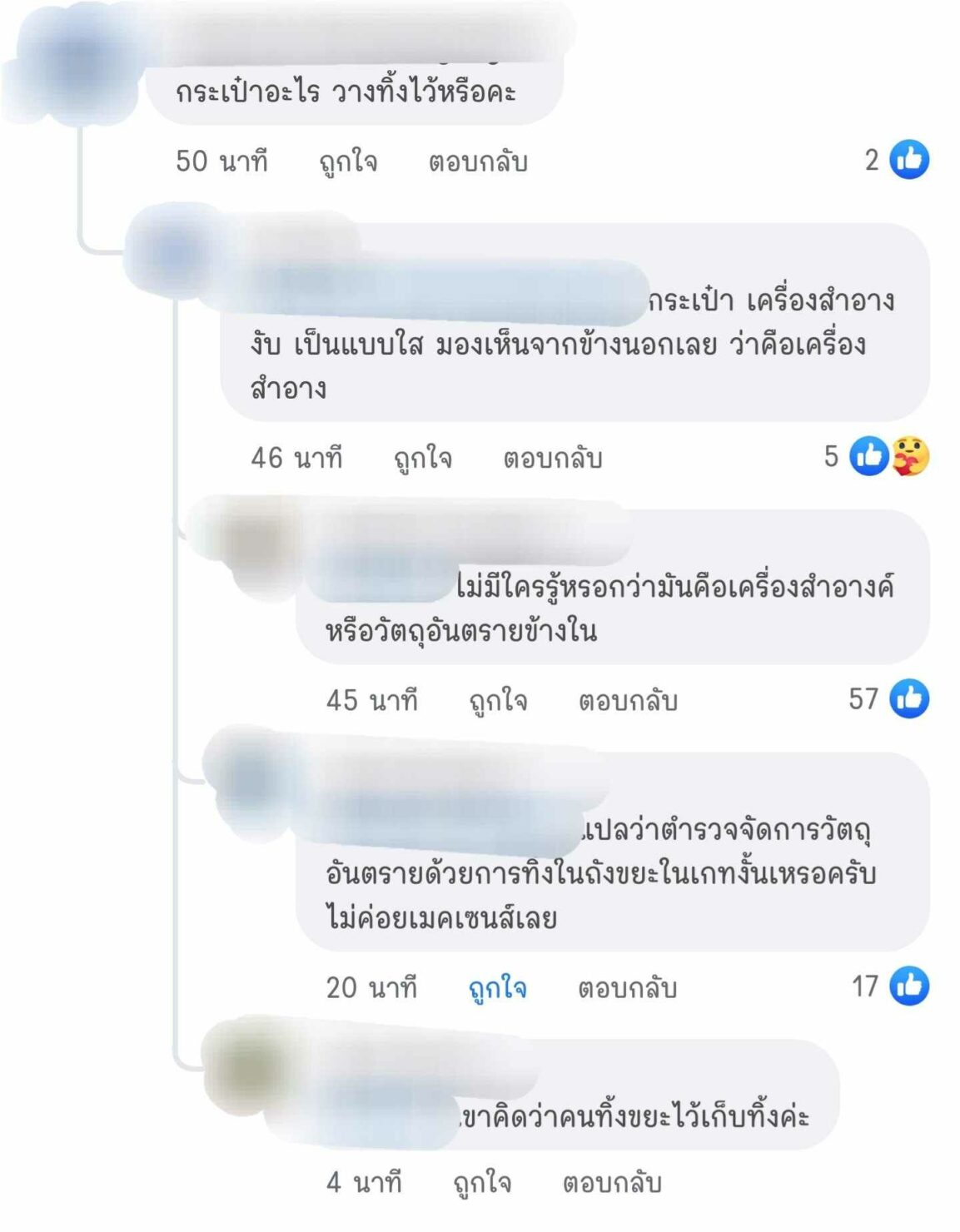 ต่อมาได้มีผู้เข้ามาสอบถามรายละเอียดใต้โพสต์ เจ้าของเรื่องได้เล่าเพิ่ม กระเป๋าที่ว่าเป็นกระเป๋าใสใส่เครื่องสำอาง ตอนแรกกลับมาไม่เห็นนึกว่าใครหยิบไป จนนักท่องเที่ยวในบริเวณนั้นบอกว่าตำรวจหยิบไปทิ้งถังขยะ จึงเดินไปถามตำรวจ แต่ก็ไม่ได้บอกรายละเอียดสาเหตุ
