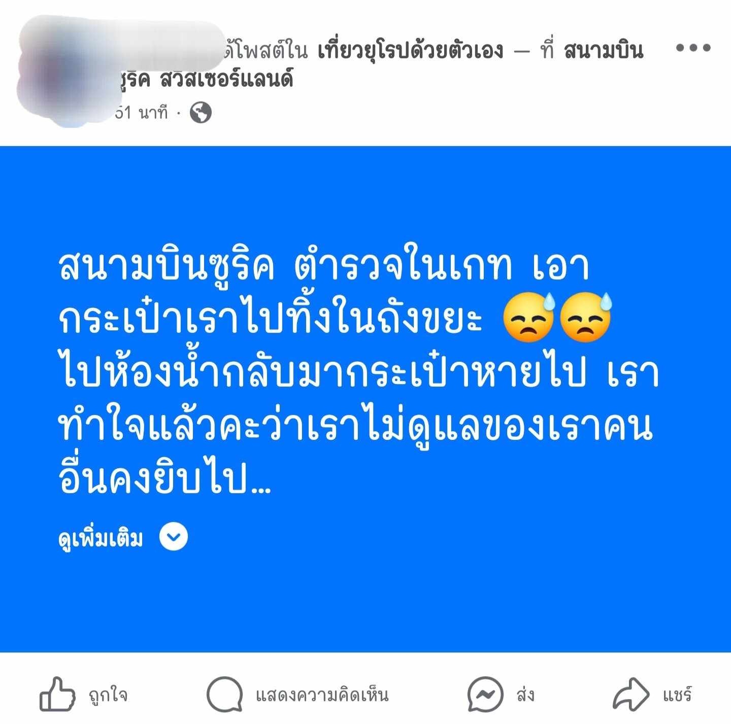 ผู้โดยสารว่ากระเป๋าของเธอถูกเจ้าหน้าที่ตำรวจสนามบินเก็บไปทิ้งในถังขยะขณะเธอเดินไปห้องน้ำ “สนามบินซูริค ตำรวจในเกท เอากระเป๋าเราไปทิ้งในถังขยะ ไปห้องน้ำกลับมากระเป๋าหายไป เราทำใจแล้วคะว่าเราไม่ดูแลของเราคนอื่นคงหยิบไป”