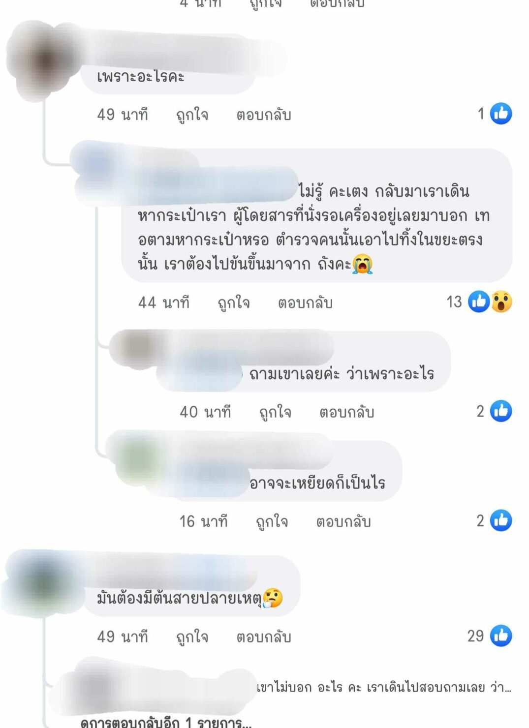 ต่อมาได้มีผู้เข้ามาสอบถามรายละเอียดใต้โพสต์ เจ้าของเรื่องได้เล่าเพิ่ม กระเป๋าที่ว่าเป็นกระเป๋าใสใส่เครื่องสำอาง ตอนแรกกลับมาไม่เห็นนึกว่าใครหยิบไป จนนักท่องเที่ยวในบริเวณนั้นบอกว่าตำรวจหยิบไปทิ้งถังขยะ จึงเดินไปถามตำรวจ แต่ก็ไม่ได้บอกรายละเอียดสาเหตุ
