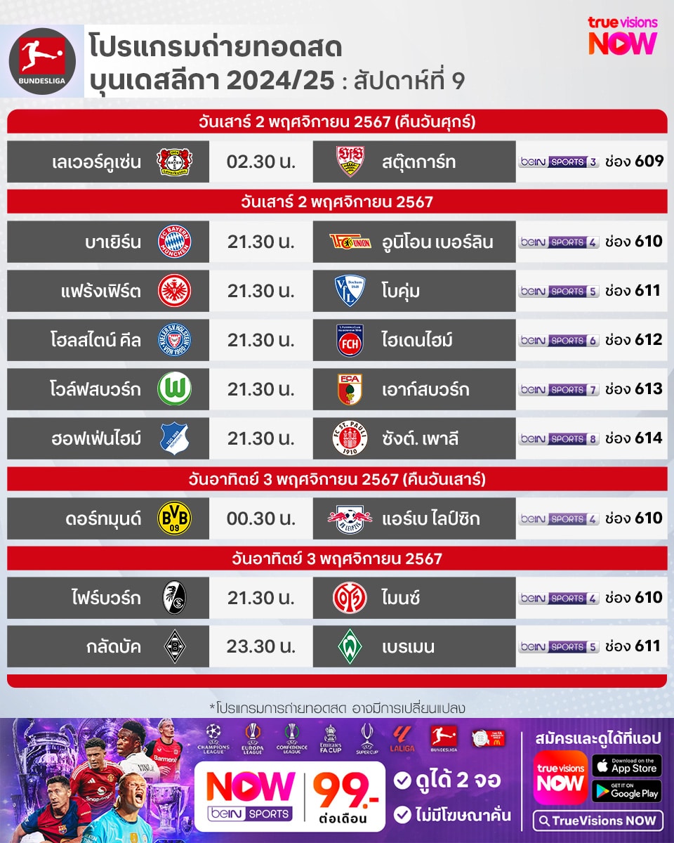 - 02:30 เลเวอร์คูเซ่น พบ สตุ๊ตการ์ท beIN Sports 3