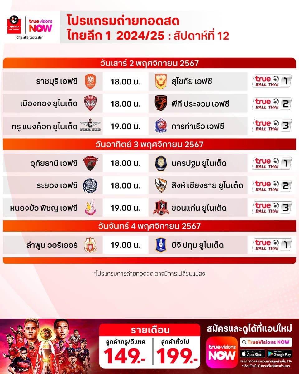 ตารางแข่งขัน รีโว่ 2024/25 ไทยลีก โปรแกรมฟุตบอลไทยลีก สัปดาห์ที่ 12 ทุกคู่ถ่ายทอดสดทาง AIS Play และ True Ball Thai