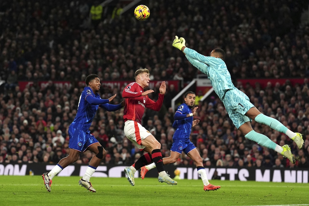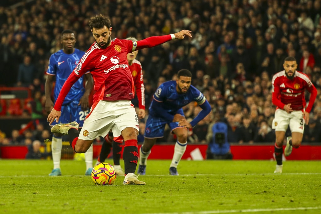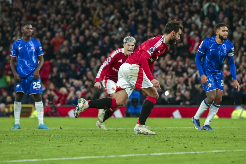 Manchester United’s Marcus Rashford, left, is challenged by Chelsea’s Moises Caicedo during the Premier League soccer match between Manchester United and Chelsea at Old Trafford stadium in Manchester, England, Sunday, Nov. 3, 2024. (AP Photo/Ian Hodgson)Manchester United’s Bruno Fernandes, centre, celebrates after scoring his side’s opening goal during the Premier League soccer match between Manchester United and Chelsea at Old Trafford stadium in Manchester, England, Sunday, Nov. 3, 2024. (AP Photo/Ian Hodgson)Manchester United’s Bruno Fernandes scores his side’s opening goal from a penalty kick during the Premier League soccer match between Manchester United and Chelsea at Old Trafford stadium in Manchester, England, Sunday, Nov. 3, 2024. (AP Photo/Ian Hodgson)Chelsea goalkeeper Robert Sanchez punches the ball clear from Manchester United’s Rasmus Hojlund, 2nd left, during the English Premier League soccer match between Manchester United and Chelsea at Old Trafford stadium in Manchester, England, Sunday, Nov. 3, 2024. (Martin Rickett/PA via AP)Manchester United’s Lisandro Martinez is challenged by Chelsea’s Malo Gusto, rear, during the Premier League soccer match between Manchester United and Chelsea at Old Trafford stadium in Manchester, England, Sunday, Nov. 3, 2024. (AP Photo/Ian Hodgson)Chelsea’s Noni Madueke, second left, fails to score during the Premier League soccer match between Manchester United and Chelsea at Old Trafford stadium in Manchester, England, Sunday, Nov. 3, 2024. (AP Photo/Ian Hodgson)