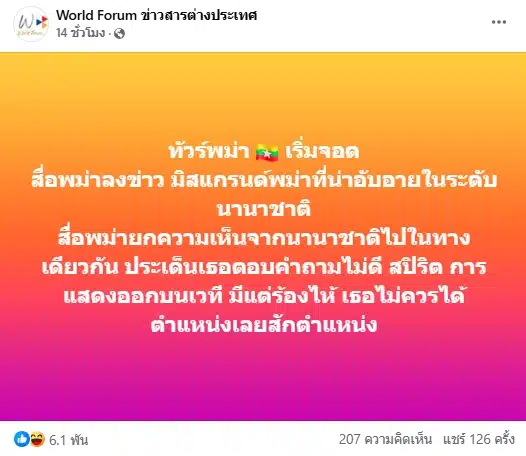 ล่าสุดดูเหมือนว่าดราม่าร้อนเวทีนางงามจะยังไม่จบ เพราะเมื่อวันที่ 2 พ.ย.ที่ผ่านมา เพจ World Forum ข่าวสารต่างประเทศ ได้มีการโพสต์ข้อความที่หน้าเพจเกี่ยวกับความเห็นของสื่อในพม่าที่มีถึง แตแต มิสแกรนด์เมียนมา 2024 สร้างความน่าอับอายในระดับนานาชาติ และยังไม่เหมาะกับตำแหน่งใดเลย