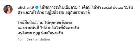 ล่าสุด 2 พ.ย.ที่ผ่านมา อั้ม อธิชาติ ก็กลับมามีการเคลื่อนไหวอีกครั้งผ่านทางอินสตาแกรมส่วนตัว atichart9 โดยเป็นการเผยสาเหตุที่ตนนั้นหายหน้าไปจากโซเชียลร่วม 1 เดือนเต็ม เนื่องจากไปปฏิบัติธรรม และทำ social detox เท่านั้น หนุ่มอั้มได้โพสต์ภาพบรรยากาศในวัดป่า พร้อมระบุแคปชั่นประกอบว่า
