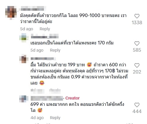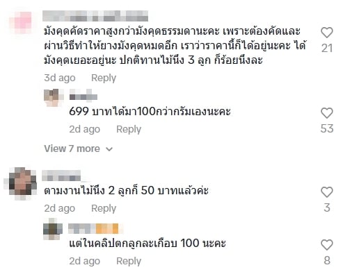 ขณะที่ชาวเน็ตต่างก็เข้ามาแสดงความคิดเห็นหลังจากได้รับสินค้าจริง และทราบราคา โดยส่วนใหญ่มองว่าราคาแพงเกินควรกับปริมาณที่ได้รับมาจริง ๆ บางคนรีวิวได้มาแค่ 7 ลูกใน 1 กล่อง แถมยังใช้กล่องพลาสติกหลายชิ้นในการสั่ง 1 ครั้ง แต่ในส่วนหนึ่งก็เข้ามาแย้งว่าราคามังคุดคัดปกติ 1 กิโลกรัมก็ราคาสูงมากอยู่แล้ว พี่เอนำมาขายพร้อมเครื่องยำต่าง ๆ ก็ดูเหมาะสมแล้ว