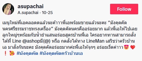 “เมนูใหม่พี่เอคลอดดแล้วนะค้าาาพี่เอพร้อมขายแล้วนะคะ “มังคุดคัด นครศรีธรรมราชทรงเครื่อง” มังคุดคัดนครคืออร่อยมาก แล้วพี่เอให้ไปเลยลูกใหญ่ๆพร้อมกับน้ำยำแสนอร่อยสูตรบ้านพี่เอ ใครอยากทานสามารถสั่งได้ที่ Line @ashop มี(@) หรือ กดสั่งได้ทาง LineMan เสริชว่าครัวบ้านเอ มาสั่งกันนะคะ มังคุดคัดอร่อยมากค่ะพี่เอให้จุกๆ อร่อยเริ่ดค่าาา”