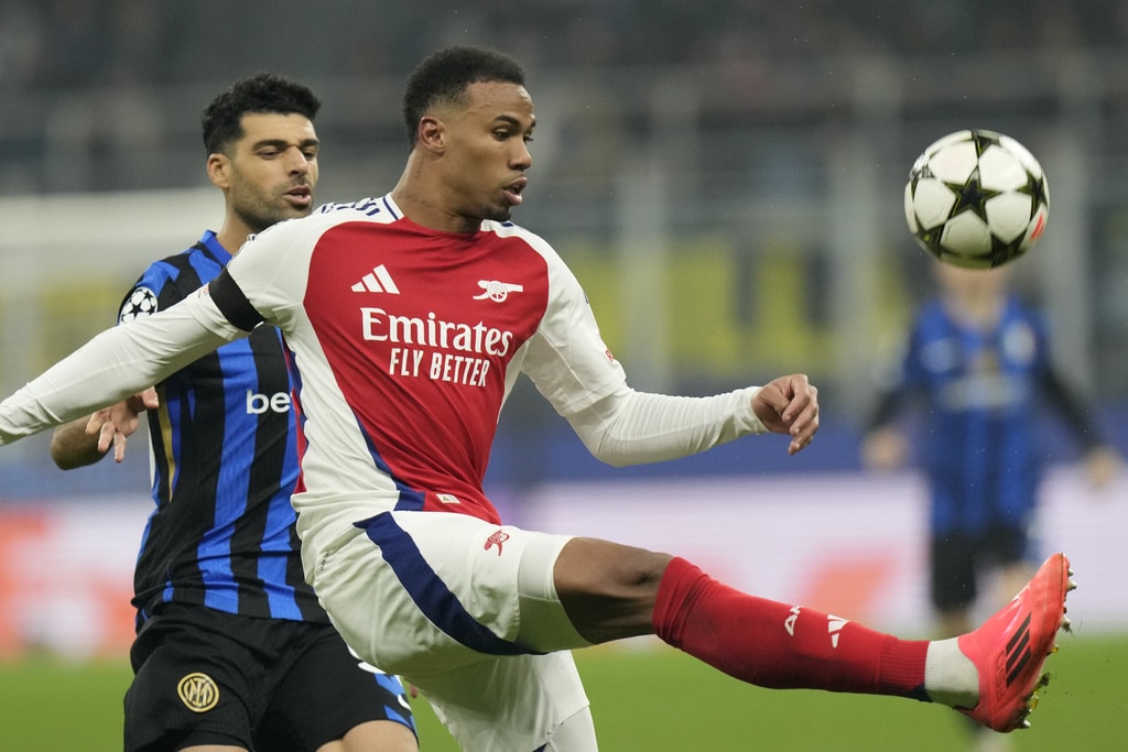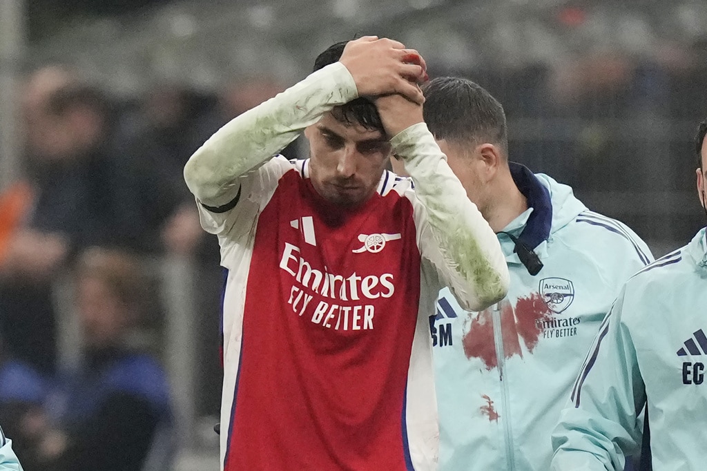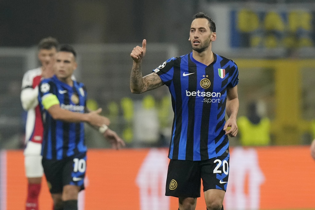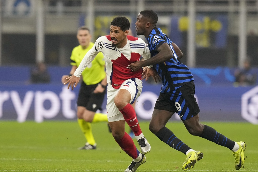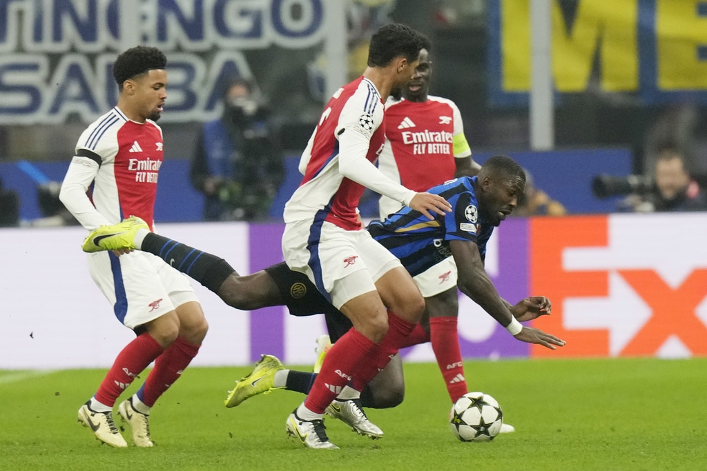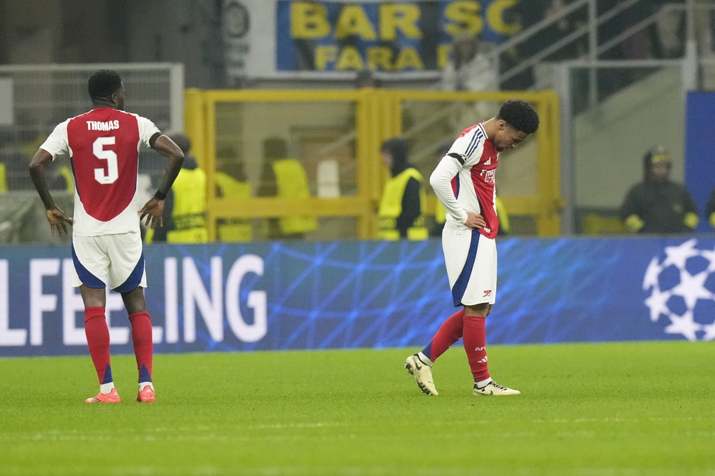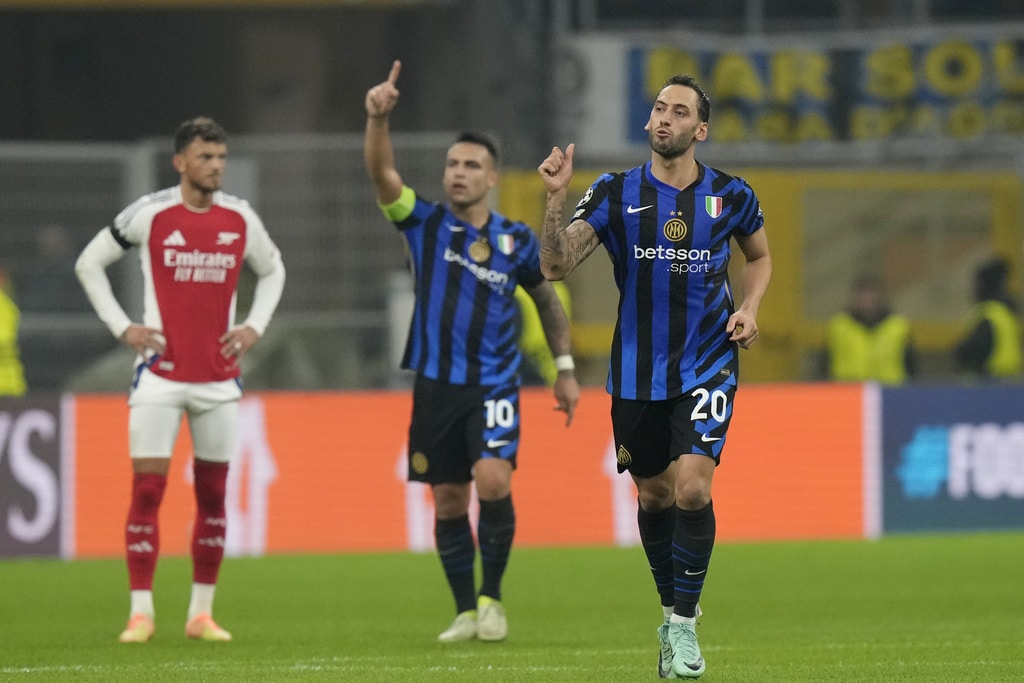 Arsenal’s Thomas Partey, left, reacts with his teammates at the end of the Champions League opening phase soccer match between Inter Milan and Arsenal at the San Siro stadium in Milan, Italy, Wednesday, Nov. 6, 2024. Inter Milan won 1-0. (AP Photo/Luca Bruno)Arsenal’s Kai Havertz leaves the pitch are injuring during a Champions League opening phase soccer match between Inter Milan and Arsenal at the San Siro stadium in Milan, Italy, Wednesday, Nov. 6, 2024. (AP Photo/Luca Bruno)Arsenal’s William Saliba, left, runs for the ball with Inter Milan’s Marcus Thuram during a Champions League opening phase soccer match between Inter Milan and Arsenal at the San Siro stadium in Milan, Italy, Wednesday, Nov. 6, 2024. (AP Photo/Luca Bruno)Inter Milan’s Marcus Thuram, right, is tackled by Arsenal’s William Saliba during a Champions League opening phase soccer match between Inter Milan and Arsenal at the San Siro stadium in Milan, Italy, Wednesday, Nov. 6, 2024. (AP Photo/Luca Bruno)Inter Milan’s Nicolo Barella, second from right, receives a yellow card during a Champions League opening phase soccer match between Inter Milan and Arsenal at the San Siro stadium in Milan, Italy, Wednesday, Nov. 6, 2024. (AP Photo/Luca Bruno)Arsenal’s Gabriel, right, challenges for the ball with Inter Milan’s Mehdi Taremi during a Champions League opening phase soccer match between Inter Milan and Arsenal at the San Siro stadium in Milan, Italy, Wednesday, Nov. 6, 2024. (AP Photo/Luca Bruno)Inter Milan’s Hakan Calhanoglu, right, celebrates with his teammate Lautaro Martinez after scoring his side’s opening goal during a Champions League opening phase soccer match between Inter Milan and Arsenal at the San Siro stadium in Milan, Italy, Wednesday, Nov. 6, 2024. (AP Photo/Luca Bruno)Inter Milan’s Hakan Calhanoglu, right, celebrates after scoring his side’s opening goal during a Champions League opening phase soccer match between Inter Milan and Arsenal at the San Siro stadium in Milan, Italy, Wednesday, Nov. 6, 2024. (AP Photo/Luca Bruno)Inter Milan’s Hakan Calhanoglu scores on a penalty his side’s opening goal during a Champions League opening phase soccer match between Inter Milan and Arsenal at the San Siro stadium in Milan, Italy, Wednesday, Nov. 6, 2024. (AP Photo/Luca Bruno)