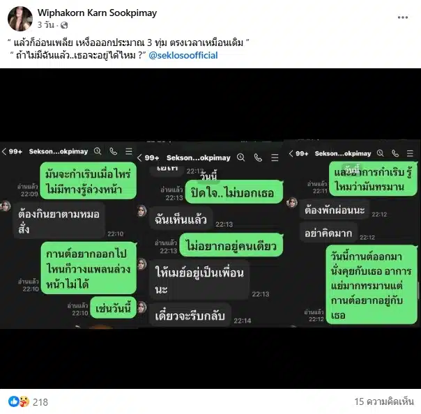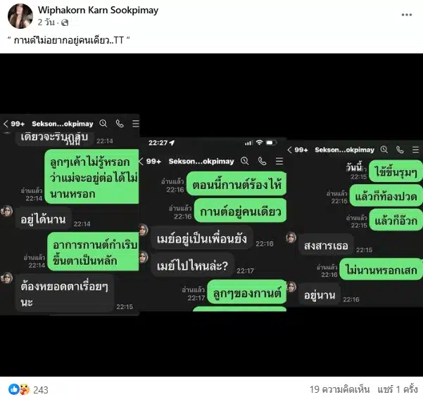 อีกทั้งก่อนหน้านี้ กานต์ ก็มีการโพสต์ภาพแชตที่พูดคุยกับสามีในช่วงที่เธอมีอาการกำเริบขึ้นมา โดยใจความในแชตมีการบอกกับเสกว่าเกิดอาการยังไงขึ้นบ้าง และไม่อยากที่จะอยู่คนเดียวลำพัง ในขณะที่เหล่าแฟนคลับต่างก็เข้ามาส่งกำลังใจให้กานต์ วิภากร หายจากอาการป่วยโดยเร็วผ่านทางช่องคอมเมนต์ใต้โพสต์
