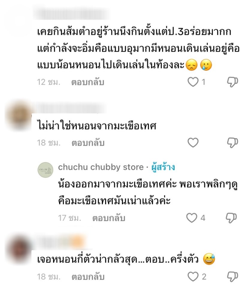 คลิปดังกล่าวมีคนเข้าดูมากถึง 3.6 แสนคน และมีชาวเน็ตเข้ามาแสดงความคิดเห็นกันเป็นจำนวนมาก บางคนก็บอกว่าไม่น่าจะใช่หนอนจอกมะเขือเทศ หรืออาจเป็นหนอนแมลงวัน ซึ่งทางเจ้าของช่องก็ได้เข้าไปตอบกลับทันทีว่า เธอลองพลิกดูแล้วมะเขือเทศชิ้นนั้นเน่าจริง ๆ ในขณะที่คอมเมนต์อื่น ๆ ก็ไม่อยากสร้างความไม่สบายใจให้สาวคนนี้เลยคอมเมนต์ในมุมตลก ๆ แทนว่า เป็นโปรตีน, ให้ฟิลเหมือนกินกุ้งเต้น, สูตรของทางร้าน, ออร์แกนิก เป็นต้น นอกจากนี้ก็มีคนเข้ามาเล่าประสบการณ์เจอหนอนในอาหารที่ตัวเองเคยเจอด้วยเช่นกัน