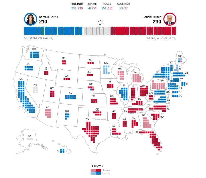 สำนักข่าว AP รายงาน หลังจากที่นับคะแนนในรัฐใหญ่เสร็จสิ้น นางแฮร์ริส ทำคะแนนขยับเข้ามาใกล้นายทรัมป์ ด้วยคะแนน 210 ต่อ 230 โดยฝั่งไหนได้ 270 เสียงก่อนจะเป็นผู้ชนะเลือกตั้ง