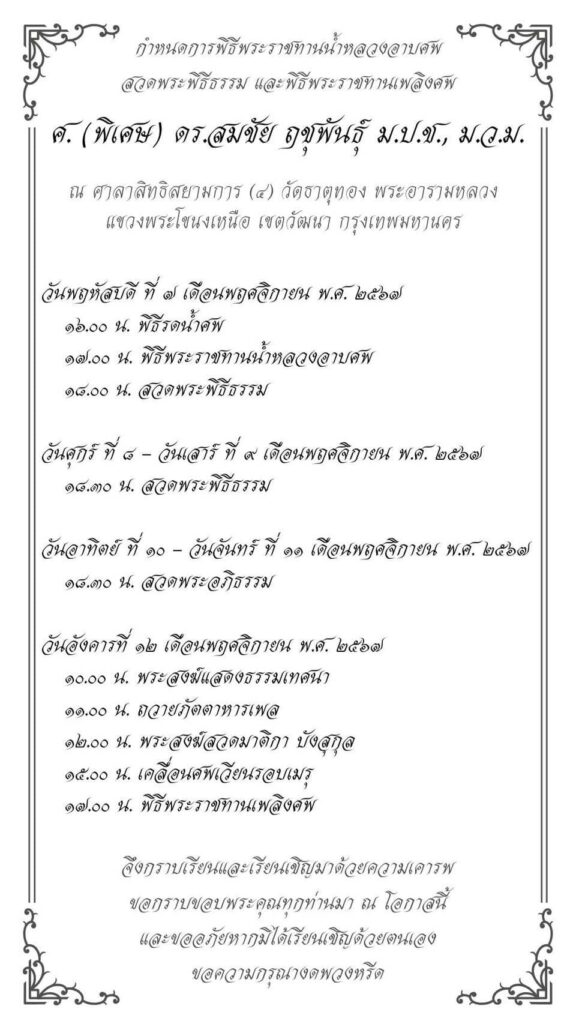 นาย สมชัย ฤชุพันธุ์ อดีตอธิบดีกรมสรรพสามิต สมาชิกสภาขับเคลื่อนการปฏิรูปประเทศ (สปช.) เสียชีวิตลงเมื่อวันที่ 5 พฤศจิกายน 2567 ด้วยอายุ 86 ปี โดยมีกำหนดการสวดพระพีธีธรรม ช่วงวันที่ 7-11 พฤศจิกายน ที่วัดธาตุทอง แขวงพระโขนงเหนือ เขตวัฒนา กรุงเทพมหานคร ก่อนจะถวายพระราชทานเพลิงศพในวันที่ 12 พฤศจิกายน