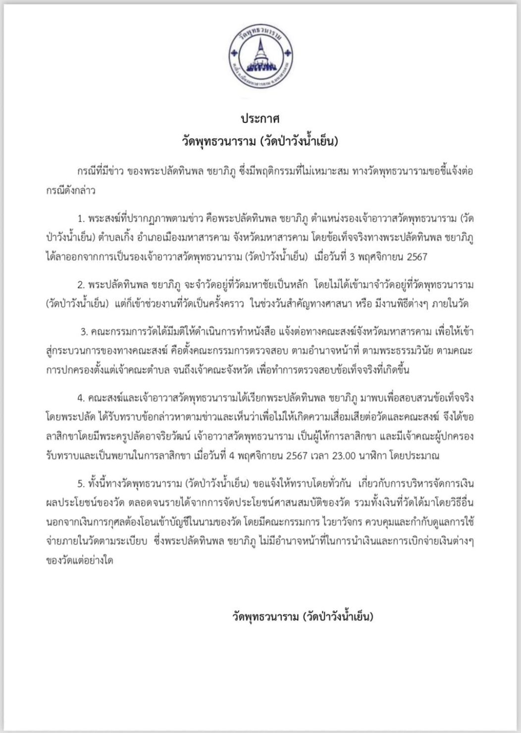 4. คณะสงฆ์และเจ้าอาวาสวัดพุทธวนารามได้เรียกพระปลัดทินพล ชยาภิภู มาพบเพื่อสอบสวนข้อเท็จจริง โดยพระปลัดได้รับทราบข้อกล่าวหาตามข่าวและเห็นว่าเพื่อไม่ให้เกิดความเสื่อมเสียต่อวัดและคณะสงฆ์ จึงได้ขอลาสิกขา โดยมีพระครูปลัดอาจริยวัฒน์ เจ้าอาวาสวัดพุทธวนาราม เป็นผู้ให้การลาสิกขา และมีเจ้าคณะผู้ปกครองรับทราบและเป็นพยานในการลาสิกขา เมื่อวันที่ 4 พฤศจิกายน 2567 เวลา 23.00 นาฬิกา โดยประมาณ