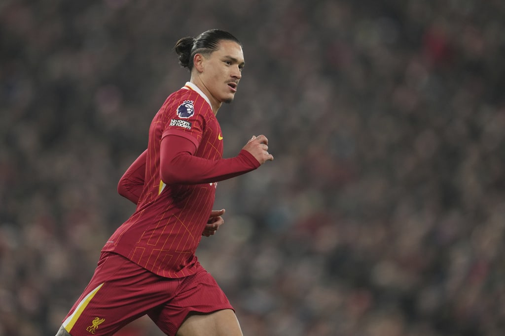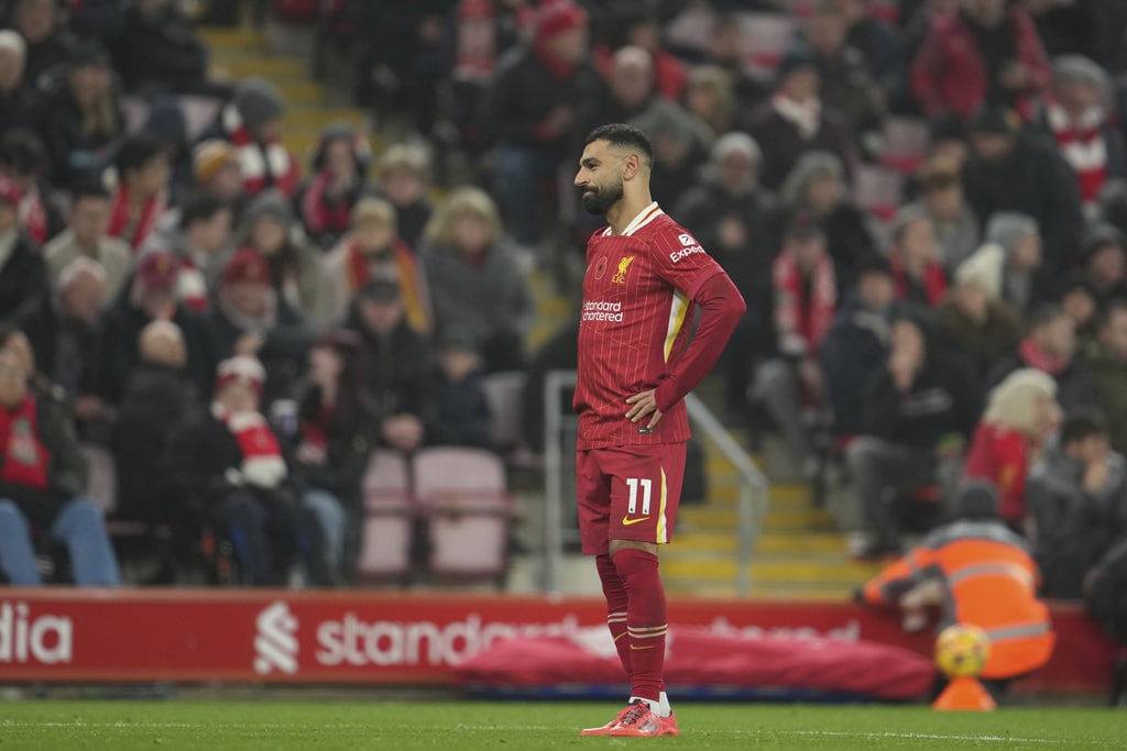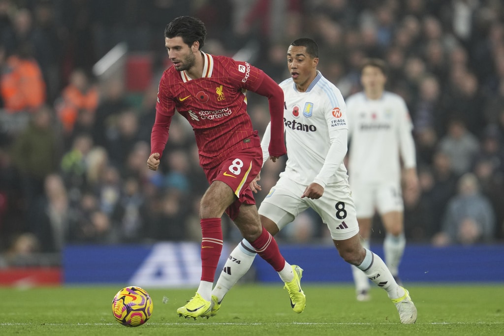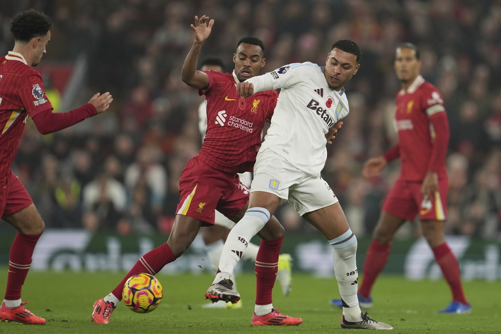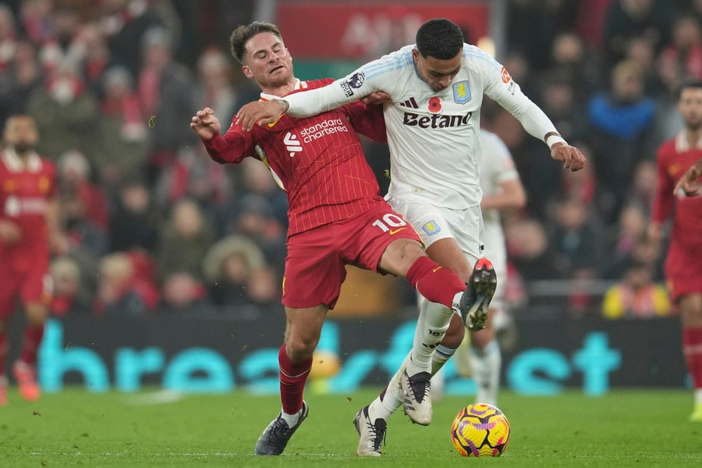 Aston Villa’s Morgan Rogers, right, Liverpool’s Ryan Gravenberch battle for the ball during the English Premier League soccer match at the Anfield stadium in Liverpool, Saturday, Nov. 9, 2024. (AP Photo/Jon Super)Liverpool’s Wataru Endo, center, and Aston Villa’s Youri Tielemans battle for the ball during the English Premier League soccer match at the Anfield stadium in Liverpool, Saturday, Nov. 9, 2024. (AP Photo/Jon Super)Aston Villa’s Ian Maatsen, right, and Liverpool’s Conor Bradley battle for the ball during the English Premier League soccer match at the Anfield stadium in Liverpool, Saturday, Nov. 9, 2024. (AP Photo/Jon Super)Aston Villa’s Morgan Rogers, right, and Liverpool’s Alexis Mac Allister battle for the ball during the English Premier League soccer match at the Anfield stadium in Liverpool, Saturday, Nov. 9, 2024. (AP Photo/Jon Super)Liverpool’s goalkeeper Caoimhin Kelleher, center, clears a ball during the English Premier League soccer match against Aston Villa at the Anfield stadium in Liverpool, Saturday, Nov. 9, 2024. (AP Photo/Jon Super)Liverpool’s Dominik Szoboszlai, front, controls ball chased by Aston Villa’s Youri Tielemans during the English Premier League soccer match at the Anfield stadium in Liverpool, Saturday, Nov. 9, 2024. (AP Photo/Jon Super)Aston Villa’s John McGinn, left, and Liverpool’s Mohamed Salah battle for the ball during the English Premier League soccer match at the Anfield stadium in Liverpool, Saturday, Nov. 9, 2024. (AP Photo/Jon Super)Liverpool’s Mohamed Salah gestures during the English Premier League soccer match against Aston Villa at the Anfield stadium in Liverpool, Saturday, Nov. 9, 2024. (AP Photo/Jon Super)Liverpool’s Darwin Nunez runs for a ball during the English Premier League soccer match against Aston Villa at the Anfield stadium in Liverpool, Saturday, Nov. 9, 2024. (AP Photo/Jon Super)