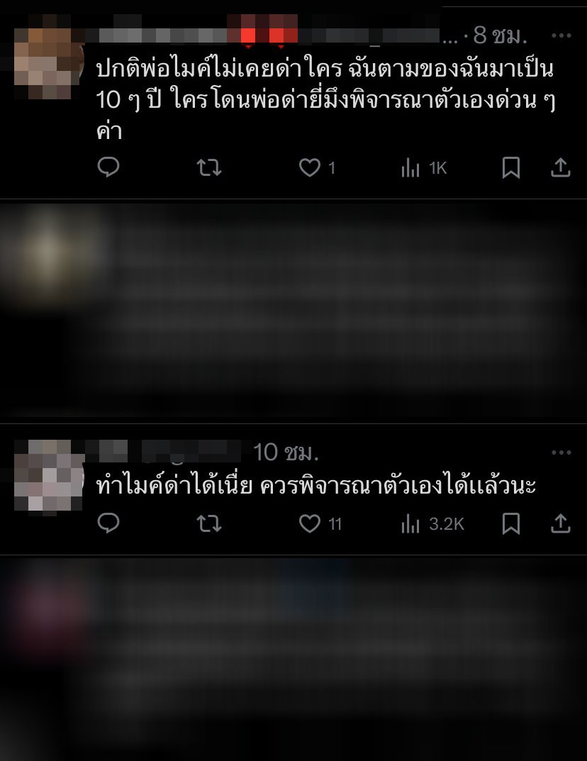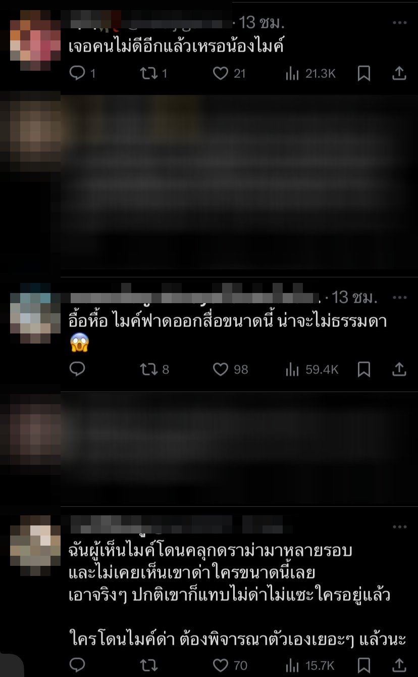 ด้านแฟนคลับต่างก็เข้ามาแสดงความคิดเห็นกันอย่างมากมาย โดยส่วนใหญ่เป็นคนที่ติดตามหนุ่มไมค์มานานหลักสิบปีขึ้นไปต่างก็รู้ดีว่าดาราดังรายนี้ไม่เคยออกมาต่อว่าด่าทอใครออกสื่อแบบนี้ แต่ครั้งนี้คงจะเหลืออดหมดความอดทนกับคน ๆ นั้นจริง ๆ
