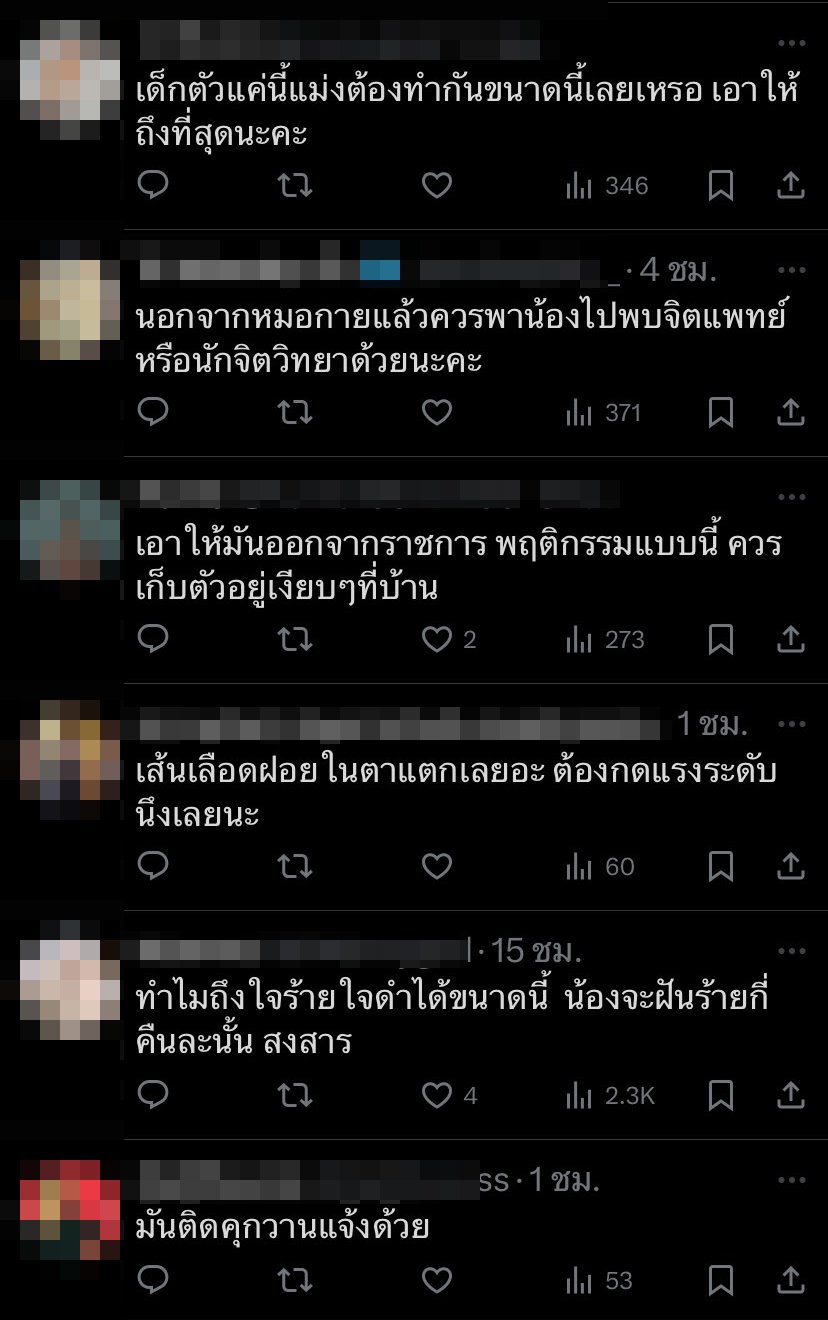 ขณะที่ชาวเน็ตได้ทราบเรื่องดังกล่าวต่างก็เข้ามาแสดงความคิดเห็นกันอย่างมากมาย โดยส่วนใหญ่อยากให้ทางครอบครัวพาน้องไปตรวจร่างกาย และไปพบจิตแพทย์ด้วย นอกจากนั้นยังสนับสนุนให้เอาเรื่องครูผู้ช่วย ที่ทำร้ายร่างกายเด็กแค่ 6 ขวบอย่างถึงที่สุด