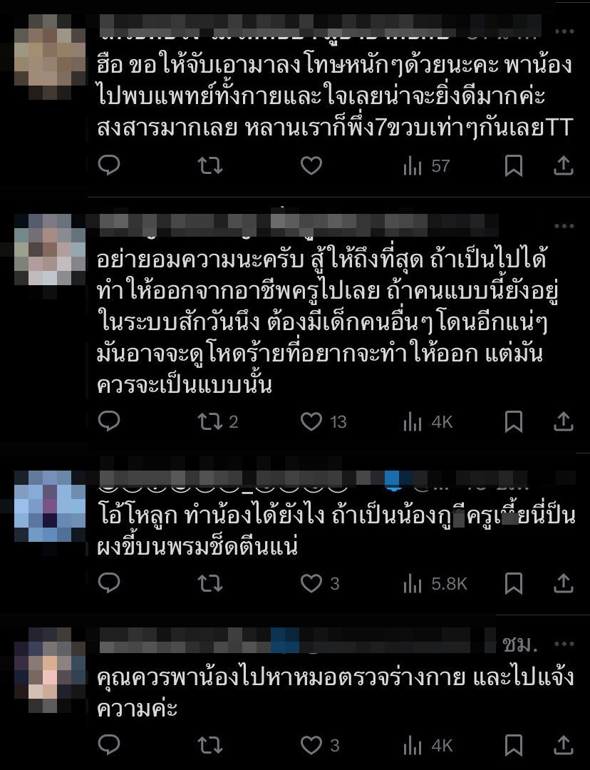 ขณะที่ชาวเน็ตได้ทราบเรื่องดังกล่าวต่างก็เข้ามาแสดงความคิดเห็นกันอย่างมากมาย โดยส่วนใหญ่อยากให้ทางครอบครัวพาน้องไปตรวจร่างกาย และไปพบจิตแพทย์ด้วย นอกจากนั้นยังสนับสนุนให้เอาเรื่องครูผู้ช่วย ที่ทำร้ายร่างกายเด็กแค่ 6 ขวบอย่างถึงที่สุด