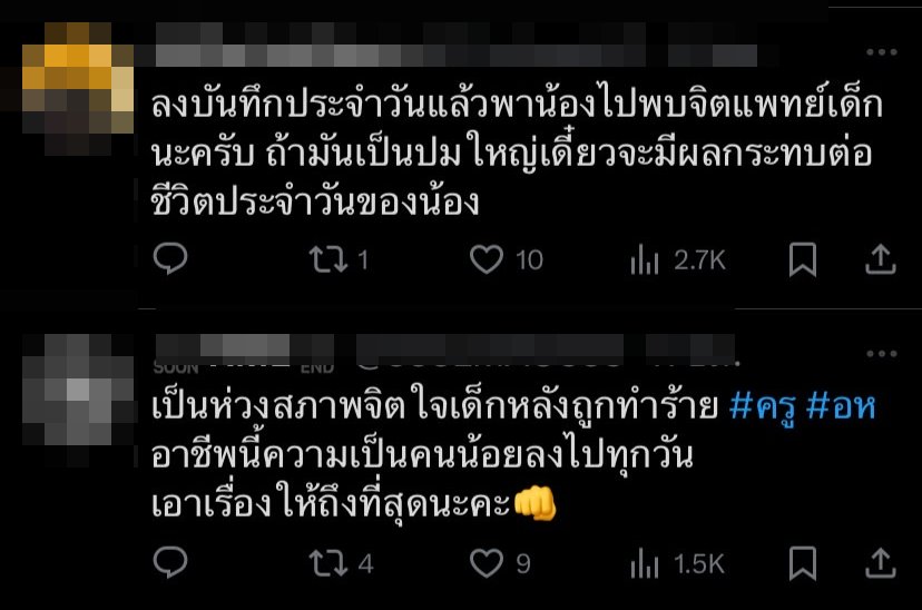 ล่าสุดผู้ใช้แอคเคาท์ X รายหนึ่งได้ออกมาโพสต์เรื่องราวที่น้องชายวัย 6 ขวบของเธอถูก ครูผู้ช่วย ทำร้ายร่างกาย ด้วยการจับกดลงกับพื้น พร้อมแนบรูปใบหน้าของเด็กชายที่เผยให้เห็น รอยช้ำกระจายเป็นวงกว้างบนใบหน้าด้านขวา ในตาข้างขวาพบเส้นเลือดฝอยในตาแตก