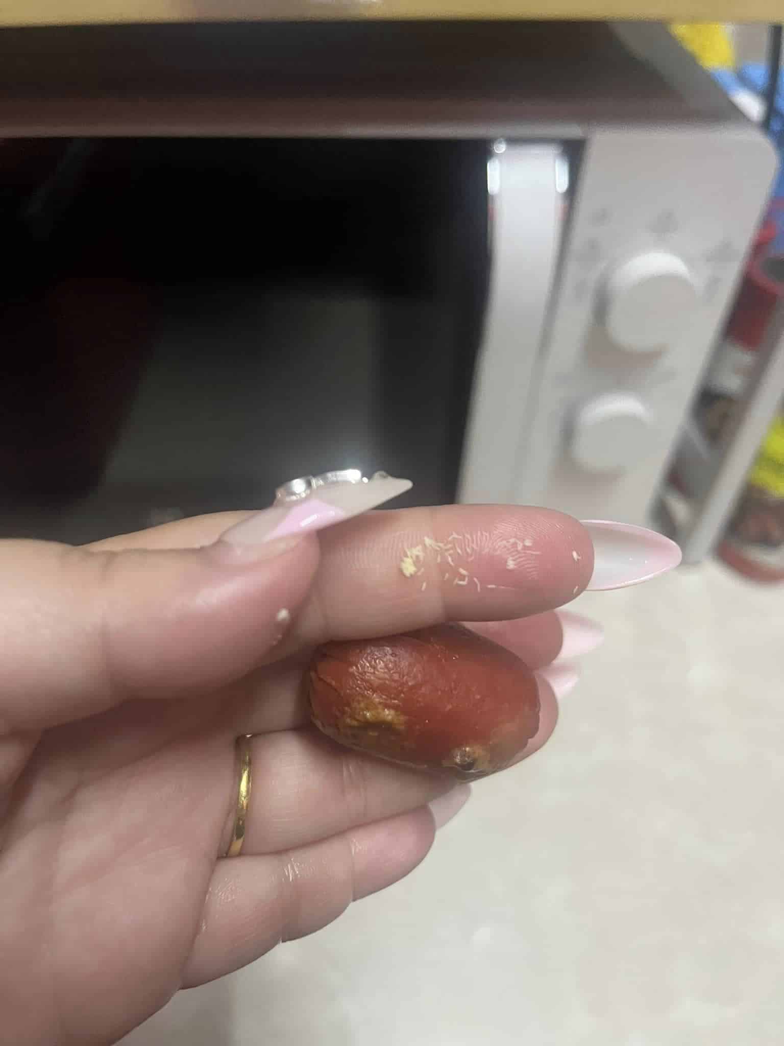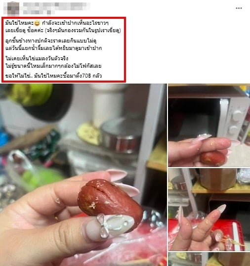 เช่นเดียวกับผู้ใช้เฟซบุ๊กรายหนึ่งออกมาแชร์ประสบการณ์การซื้อลูกชิ้นทอดร้านข้างทาง แต่กลับเจอสิ่งแปลกปลอมติดมากับไส้กรอกแดง นั่นก็คือ “ไข่แมลงวัน” โชคดีมากที่สาวรายนี้ยังไม่ทันได้กิน เนื่องจากเธอเห็นก่อนว่ามีอะไรขาว ๆ ติด เลยใช้นิ้วเขี่ยดู ก่อนจะถ่ายรูปและนำมาโพสต์ในกลุ่มเฟซบุ๊ก พวกเราคือผู้บริโภค