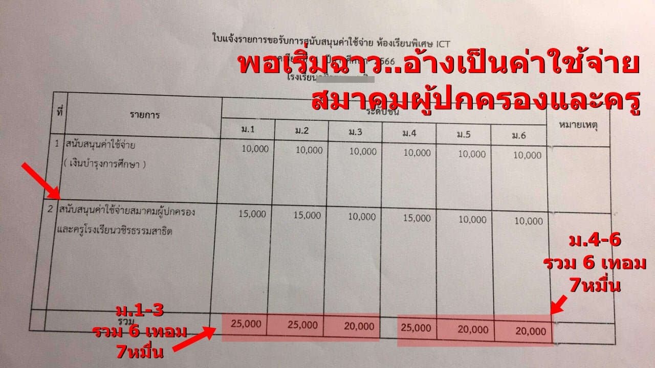 สร้างความสงสัยให้แก่ผปค. จนนำไปสู่การร้องเรียน พอเริ่มฉาวเริ่มมีการอ้างว่า เงินที่จ่ายนั้นไม่ใช่ค่าโน๊ตบุ๊ค แต่เป็นเงินเพื่อสนับสนุนสมาคมผู้ปกครองและครูภายในโรงเรียน ซึ่งปกติก็เรียกเก็บเงินไปแล้วเทอมละหมื่น