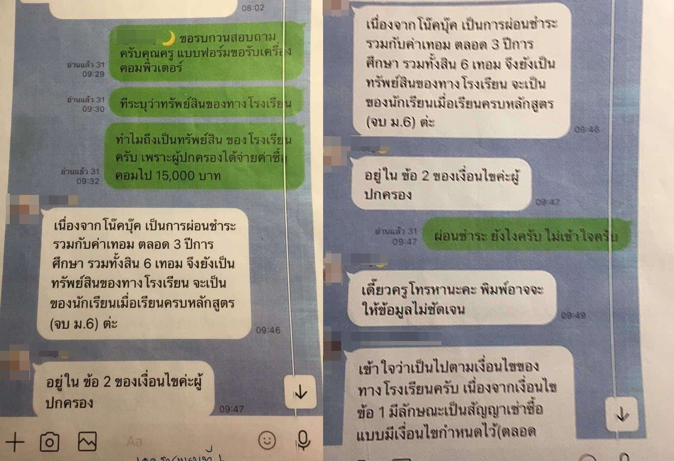 เมื่อเราสอบถาม ผปค.ปรากฎว่าเป็นเรื่องจริงโดยเป็นห้องเรียนพิเศษ ICT ต้องใช้โน๊ตบุ๊คในการเรียนรู้ โดย ผปค.ยืนยันว่ามีโน๊ตบุ๊คอยู่แล้วสามารถนำมาใช้ในการเรียนรู้ได้เลย แต่ทางโรงเรียนไม่ยอม ต้องให้ซื้อจากทางโรงเรียนเท่านั้น โดยแบ่งจ่ายเป็นเทอม ๆ