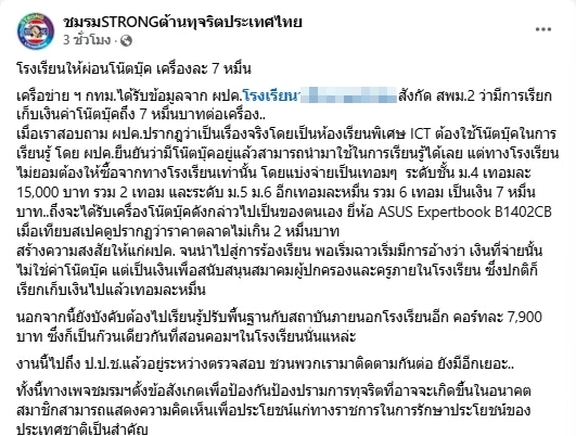 วันที่ 10 พฤศจิกายน 2567 เพจเฟซบุ๊ก ชมรมSTRONGต้านทุจริตประเทศไทย ได้มีการโพสต์ข้อความแฉโรงเรียนดังแห่งหนึ่ง ตั้งอยู่ในพื้นที่กรุงเทพมหานคร สังกัด สพม.2 บังคับให้นักเรียนห้องเรียนพิเศษ ICT ซื้อโน้ตบุ๊กเครื่องละ 7 หมื่นบาท โดยอนุญาตให้ผ่อนได้ 6 เทอม เทอมละ 1.5 หมื่นบาท เมื่อตรวจสอบราคาจากยี่ห้อและรุ่นที่แจ้งมานั้นความจริงไม่ถึง 3 หมื่นบาท พอเรื่องเริ่มแดง ผู้ปกครองเริ่มรู้ความจริงกลับอ้างว่าเป็นค่าสนับสนุนสมาคมผู้ปกครองและครูภายในโรงเรียน