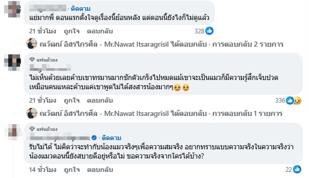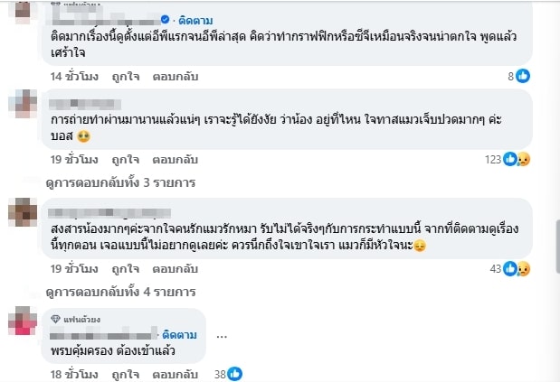 หลังจากโพสต์ได้ไม่นานด้านชาวเน็ตต่างก็เข้ามาแสดงความคิดเห็นกันอย่างมากมาย โดยส่วนใหญ่พูดเป็นเสียงเดียวกันว่า ตอนแรกก็ติดตามอยู่ พอมาเจอฉากนี้เข้าไปไม่ขอดูต่อแล้ว ไม่คิดว่าจะวางยาสลบแมวเพื่อให้ได้ฉากละครที่สมจริง