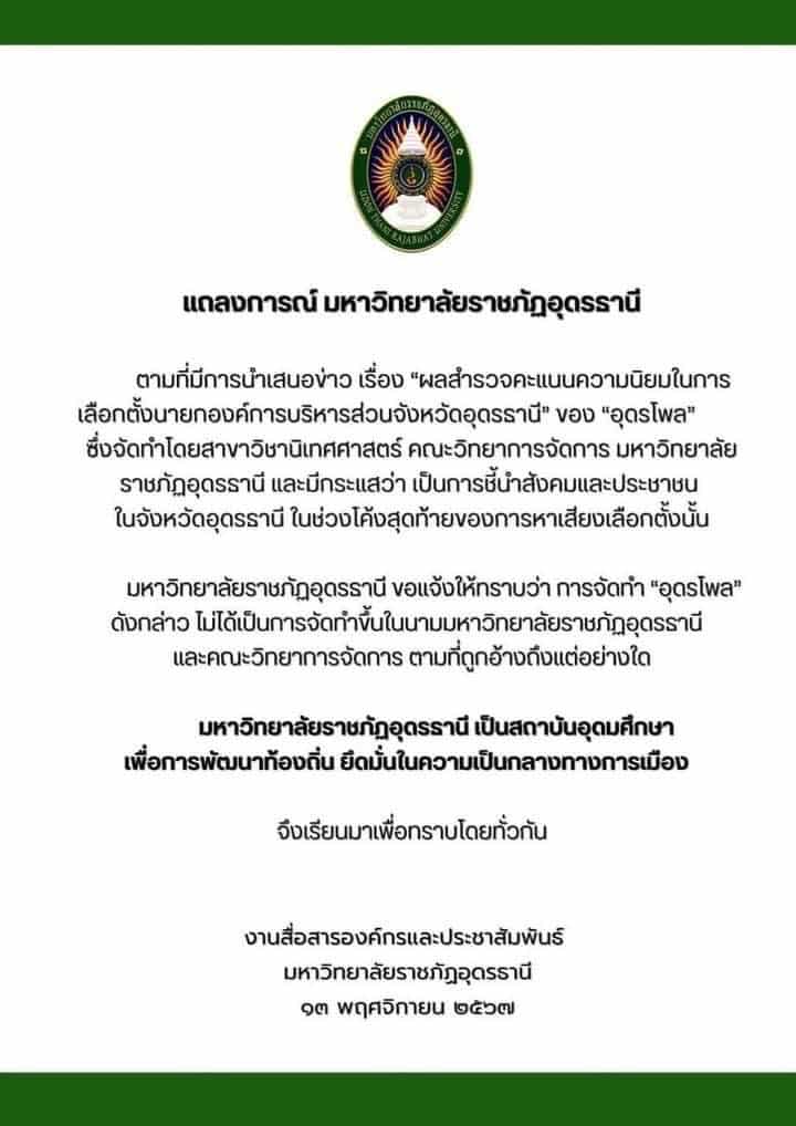 อธิการบดีมหาวิทยาลัยราชภัฎอุดรธานี ติดต่อมาที่คุณวิเชียร ขาวขำ อดีตนายกอบจ.อุดรฯ เพื่อแสดงความบริสุทธิ์ใจ ว่าอุดรโพลที่ออกข่าวเรื่องสำรวจคะแนนนิยมเลือกตั้งนายกฯอบจ. ไม่ได้ทำในนามสถาบัน หรือคณะใดๆของราชภัฎทั้งสิ้น