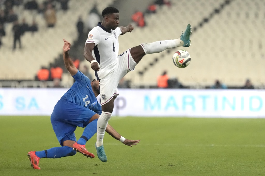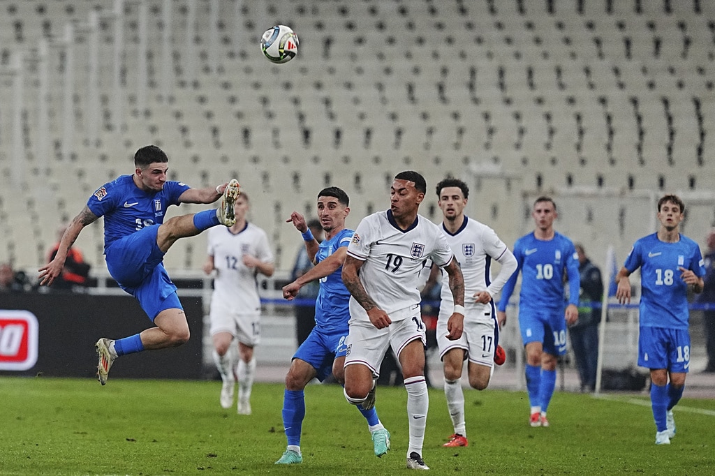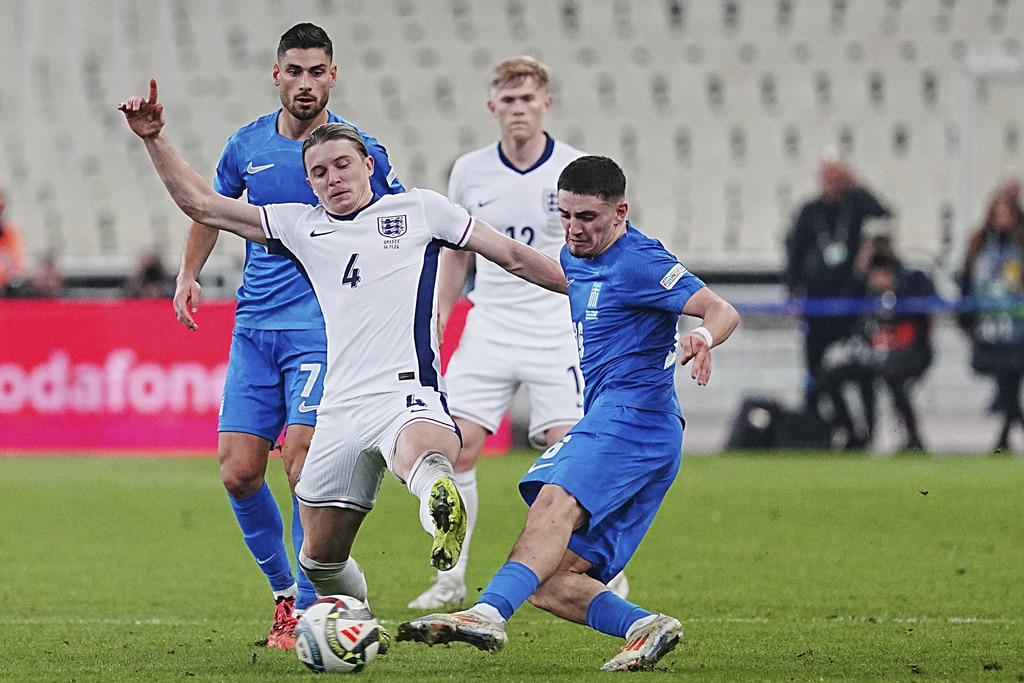 Konstantinos Koulierakis of Greece controls the ball during the UEFA Nations League Group F soccer match between Greece and England at Olympic Stadium in Athens, Thursday, Nov. 14, 2024. (AP Photo/Petros Giannakouris)England’s Harry Kane, left, and Dimitris Giannoulis of Greece, right, fight for the ball during the UEFA Nations League Group F soccer match between Greece and England at Olympic Stadium in Athens, Thursday, Nov. 14, 2024. (AP Photo/Petros Giannakouris)Christos Zafeiris of Greece of Greece kicks the ball during the UEFA Nations League Group F soccer match between Greece and England at Olympic Stadium in Athens, Thursday, Nov. 14, 2024. (AP Photo/Petros Giannakouris)England’s Curtis Jones, left, shakes hands as celebrates with his teammate Morgan Gibbs-White, after scoring the third goal against Greece during the UEFA Nations League Group F soccer match between Greece and England at Olympic Stadium in Athens, Thursday, Nov. 14, 2024. (AP Photo/Petros Giannakouris)England’s manager Lee Carsley reacts during the UEFA Nations League Group F soccer match between Greece and England at Olympic Stadium in Athens, Thursday, Nov. 14, 2024. (AP Photo/Petros Giannakouris)England’s Anthony Gordon reacts during the UEFA Nations League Group F soccer match between Greece and England at Olympic Stadium in Athens, Thursday, Nov. 14, 2024. (AP Photo/Petros Giannakouris)England’s Marc Guehi, right, and Vangelis Pavlidis of Greece vie for the ball during the UEFA Nations League Group F soccer match between Greece and England at Olympic Stadium in Athens, Thursday, Nov. 14, 2024. (AP Photo/Petros Giannakouris)England’s Conor Gallagher, left, and Christos Zafeiris of Greece fight for the ball during the UEFA Nations League Group F soccer match between Greece and England at Olympic Stadium in Athens, Thursday, Nov. 14, 2024. (AP Photo/Petros Giannakouris)