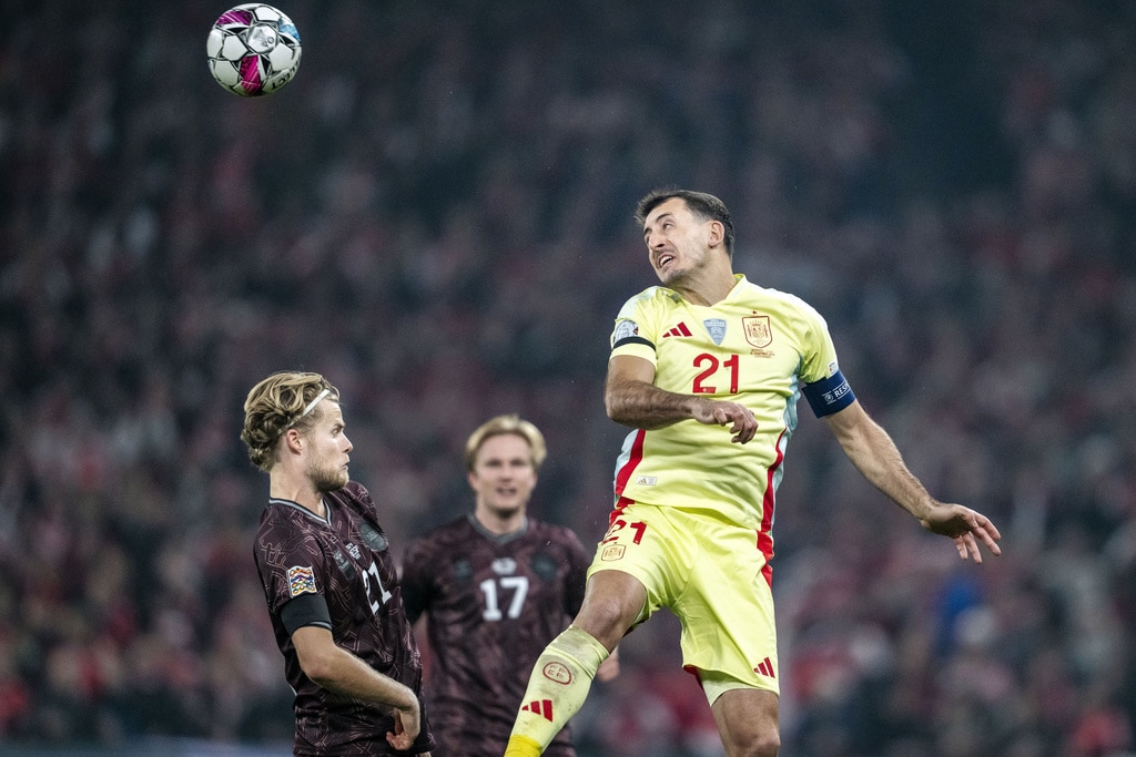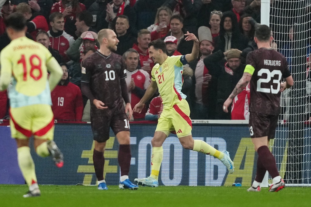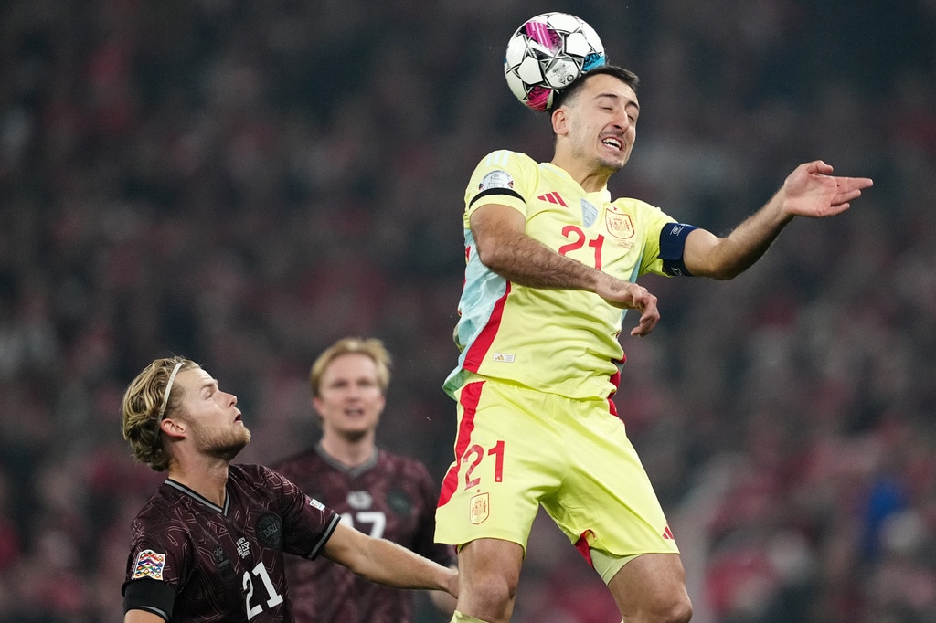 Denmark’s Morten Hjulmand and Spain’s Mikel Oyarzabal, right, in action during the UEFA Nations League match between Denmark and Spain at Parken in Copenhagen, Friday, Nov. 15, 2024. (Mads Claus Rasmussen/Ritzau Scanpix via AP)Spain’s Mikel Oyarzabal celebrates scoring during the UEFA Nations League match between Denmark and Spain at Parken in Copenhagen, Friday, Nov. 15, 2024. (Mads Claus Rasmussen/Ritzau Scanpix via AP)Spain’s Mikel Merino and Denmark’s Rasmus Hoejlund, right, in action during the UEFA Nations League match between Denmark and Spain at Parken in Copenhagen, Friday, Nov. 15, 2024. (Mads Claus Rasmussen/Ritzau Scanpix via AP)Denmark’s Morten Hjulmand, left, and Spain’s Mikel Oyarzabal in action during the UEFA Nations League match between Denmark and Spain at Parken in Copenhagen, Friday, Nov. 15, 2024. (Mads Claus Rasmussen/Ritzau Scanpix via AP)Denmark’s Morten Hjulmand and Spain’s Porro Pedro, right, in action during the UEFA Nations League match between Denmark and Spain at Parken in Copenhagen, Friday, Nov. 15, 2024. (Mads Claus Rasmussen/Ritzau Scanpix via AP)