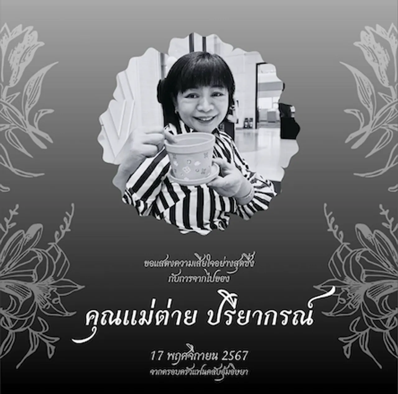 นางเอกสาวช่อง 3 อุ้ม อิษยา ฮอสุวรรณ โพสต์อินสตาแกรมแจ้งข่าวเศร้า คุณแม่ต่าย ปรียากรณ์ สุขภูมิ เสียชีวิตแล้ว โดยกำหนดการสวดพระอภิธรรม จะจัดขึ้นที่ศาลา 1 วัดโพธิวณาราม อำเภอเมือง จังหวัดอุดรธานี ระหว่างวันที่ 18-21 พฤศจิกายน 2567