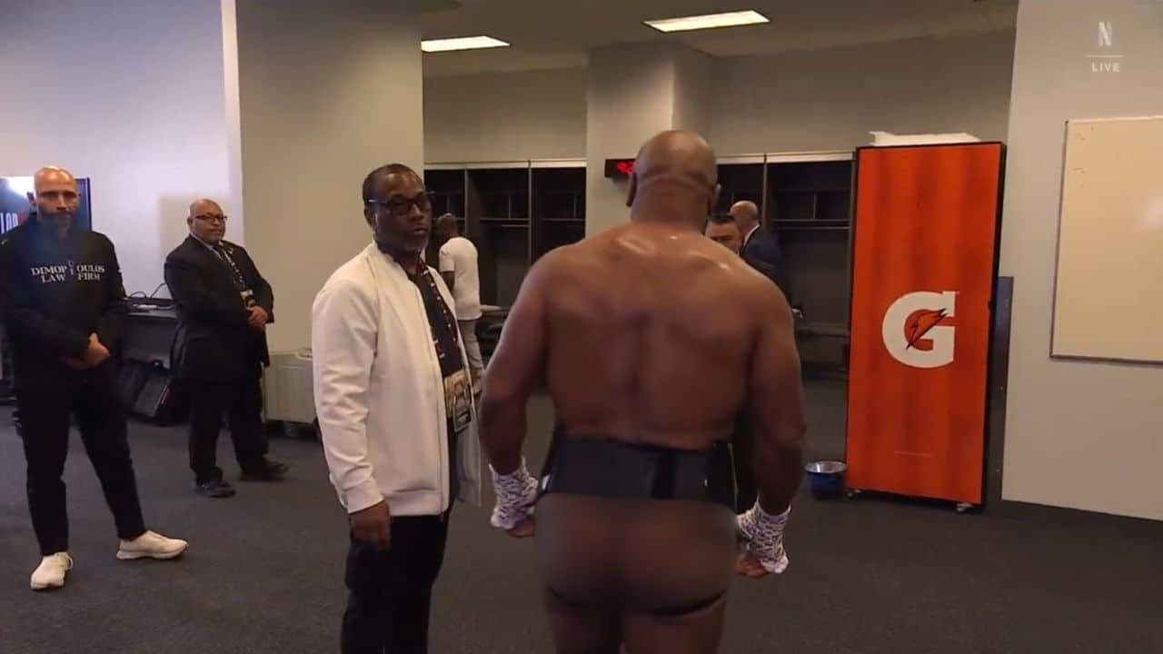 ทว่าสิ่งที่ทำแฟนมวยสนใจกลับเป็นจังหวะหลังจากนั้น เพราะหลังจากที่ ไทสัน ตอบคำถามและจับมือกับพิธีกรเสร็จ ตากล้องก็ได้แพลนไฟหาอดีตนักชกคนดัง แต่กลายเป็นว่าเจ้าตัวกำลังหันหลังอยู่ ทำให้ผู้ชมทั่วโลกได้เห็นก้นของอดีตแชมป์โลกรายนี้แบบเต็มสองตา