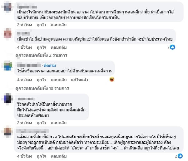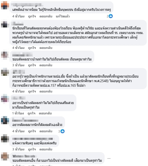 ขณะที่ชาวเน็ตต่างก็เข้ามาแสดงความคิดเห็นกันอย่างมากมายถึงพฤติกรรมของครูรายนี้ว่าไม่เหมาะสมอย่างมาก ควรเอาเวลาที่จ้องจับผิดทรงผมของนักเรียนไปมุ่งเน้นพัฒนาการสอนให้ดีขึ้นกว่าเดิมจะดี ทั้งยังแนะนำให้เด็กนักเรียนที่โดนกระทำร้องเรียนหน่วยงานที่เกี่ยวข้อง