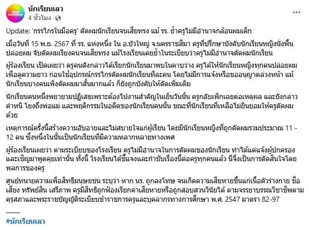 เพจ นักเรียนเลว แฉ ครู รร.มัธยม สังกัดอบจ.โคราช ใช้อำนาจในทางที่ผิด บังคับตัดผมนร.หญิง จนแหว่ง 12 คน รวมนร.เพศทางเลือก แถมด่าโยงถึงพ่อแม่