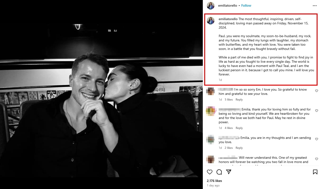 เมื่อวันที่ 18 พ.ย. ที่ผ่านมา Emilia Torello (เอมิเลีย โทเรลโล) คู่หมั้นของ Teal (ทีล) แจ้งข่าวการเสียชีวิตของอดีตดาราดังเอาไว้ผ่านทางอินสตาแกรมของเธอ โดยได้โพสต์ภาพคู่ พร้อมระบุข้อความว่า