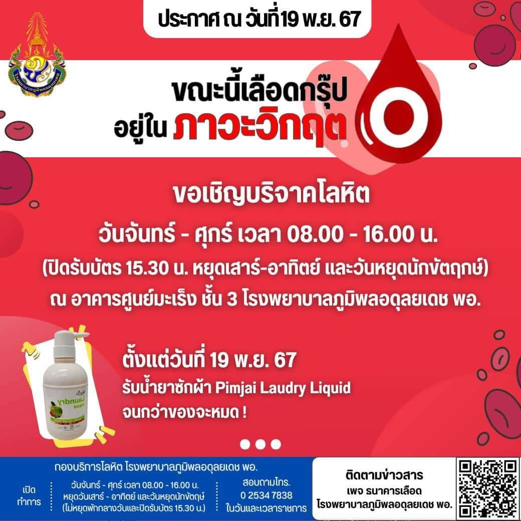 วันนี้ ผู้สื่อข่าวรายงาน ธนาคารเลือด โรงพยาบาลภูมิพลอดุลยเดช พอ. แจ้งสถานการณ์โลหิตกรุ๊ป O กำลังอยู่ในภาวะวิกฤต ขอเชิญชวนประชาชนผู้มีสุขภาพแข็งแรงร่วมบริจาคโลหิตเพื่อช่วยเหลือผู้ป่วยในภาวะเร่งด่วน พร้อมรับของที่ระลึก น้ำยาซักผ้า Pimjai Laundry Liquid ที่จัดเตรียมไว้สำหรับผู้บริจาค ตั้งแต่วันที่ 19 พฤศจิกายน 2567 เป็นต้นไป (จนกว่าของจะหมด)