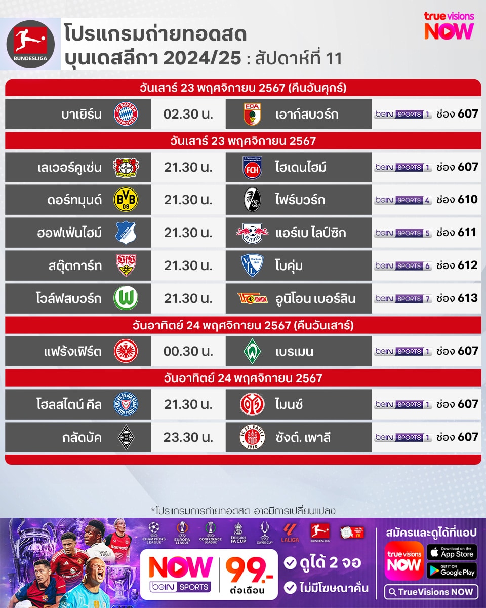 โปรแกรมพร้อมช่องดูบอลสด บุนเดสลีกา เยอรมัน 2024/25 สัปดาห์ที่ 11 แข่ง 22-24 พ.ย นี้