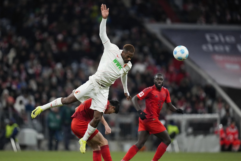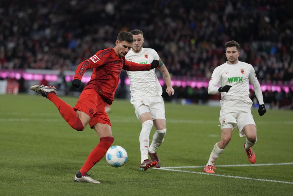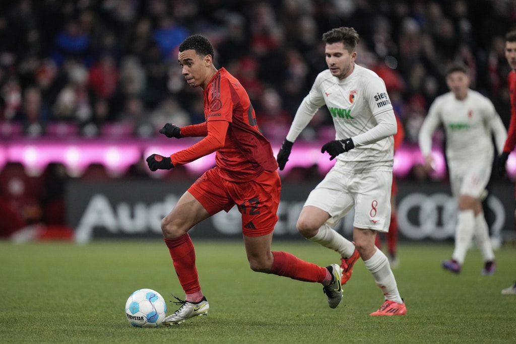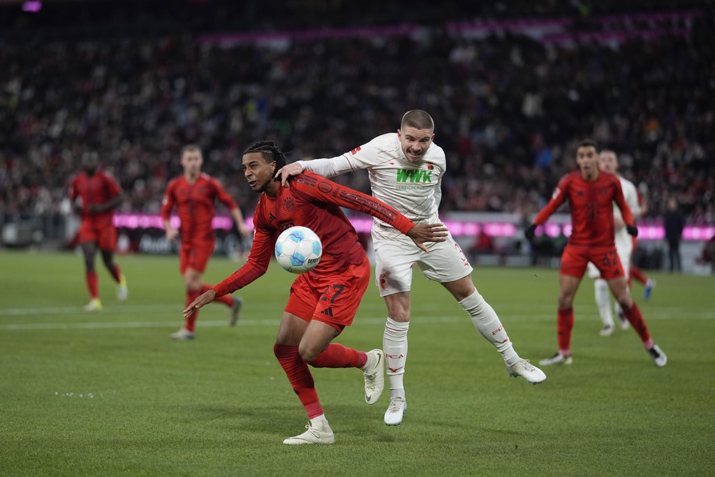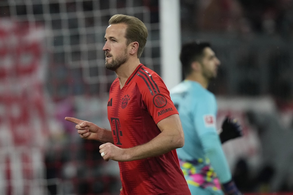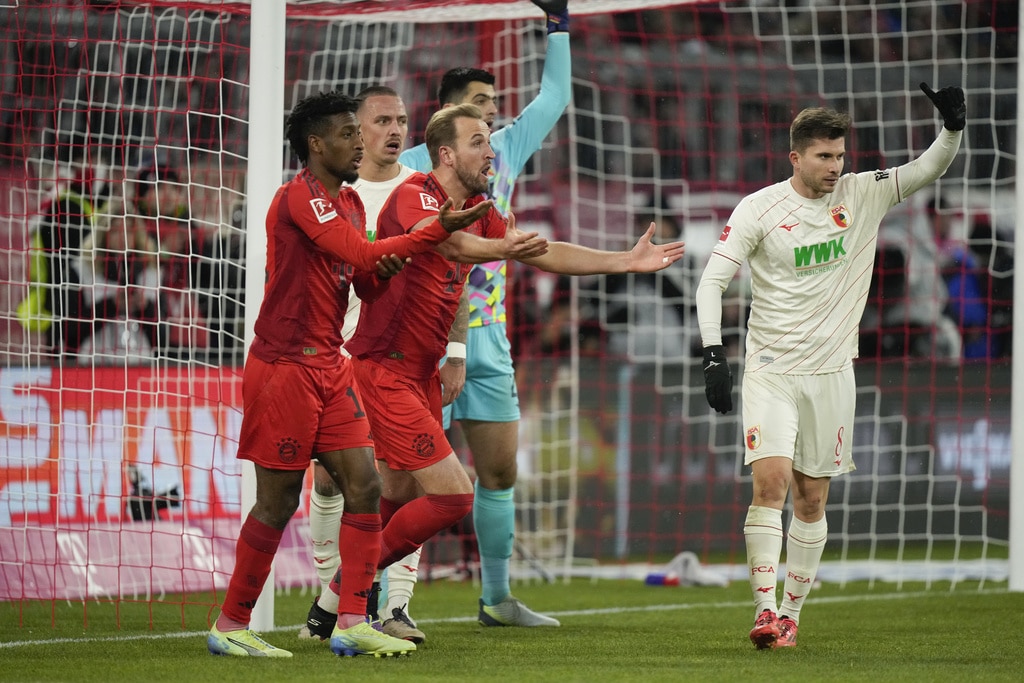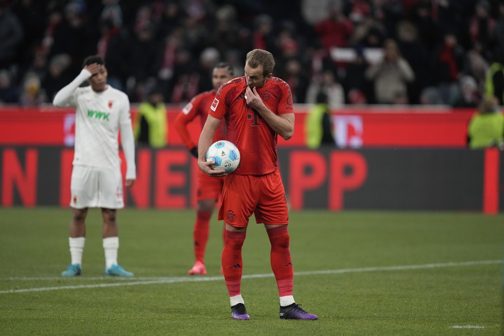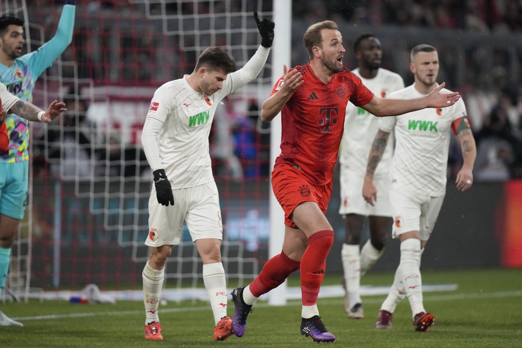 Bayern’s Konrad Laimer, challenges for the ball with Augsburg’s Mads Valentin during the Bundesliga soccer match between Bayern Munich and Augsburg at the Allianz Arena in Munich, Germany, Friday, Nov. 22, 2024. (AP Photo/Matthias Schrader)Bayern’s Harry Kane, prepares for his second penalty kick during the Bundesliga soccer match between Bayern Munich and Augsburg at the Allianz Arena in Munich, Germany, Friday, Nov. 22, 2024. (AP Photo/Matthias Schrader)Augsburg’s Samuel Essende, left, challenge for the ball with Bayern’s Kim Min-jae during the Bundesliga soccer match between Bayern Munich and Augsburg at the Allianz Arena in Munich, Germany, Friday, Nov. 22, 2024. (AP Photo/Matthias Schrader)Bayern’s Jamal Musiala, left, runs with the ball in front of Augsburg’s Elvis Rexhbecaj during the Bundesliga soccer match between Bayern Munich and Augsburg at the Allianz Arena in Munich, Germany, Friday, Nov. 22, 2024. (AP Photo/Matthias Schrader)Bayern’s Harry Kane, third left, reacts to referee asking for a penalty during the Bundesliga soccer match between Bayern Munich and Augsburg at the Allianz Arena in Munich, Germany, Friday, Nov. 22, 2024. (AP Photo/Matthias Schrader)Bayern’s Harry Kane, reacts to referee asking for a penalty during the Bundesliga soccer match between Bayern Munich and Augsburg at the Allianz Arena in Munich, Germany, Friday, Nov. 22, 2024. (AP Photo/Matthias Schrader)Bayern’s Harry Kane, second left, celebrates with teammates after scoring the opening goal with the penalty kick during the Bundesliga soccer match between Bayern Munich and Augsburg at the Allianz Arena in Munich, Germany, Friday, Nov. 22, 2024. (AP Photo/Matthias Schrader)Bayern’s Harry Kane celebrates after scoring the opening goal with the penalty kick during the Bundesliga soccer match between Bayern Munich and Augsburg at the Allianz Arena in Munich, Germany, Friday, Nov. 22, 2024. (AP Photo/Matthias Schrader)Bayern’s Leon Goretzka kicks the ball during the Bundesliga soccer match between Bayern Munich and Augsburg at the Allianz Arena in Munich, Germany, Friday, Nov. 22, 2024. (AP Photo/Matthias Schrader)