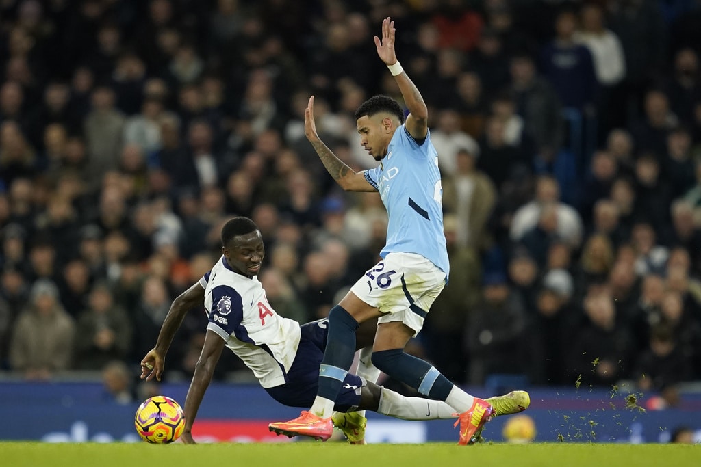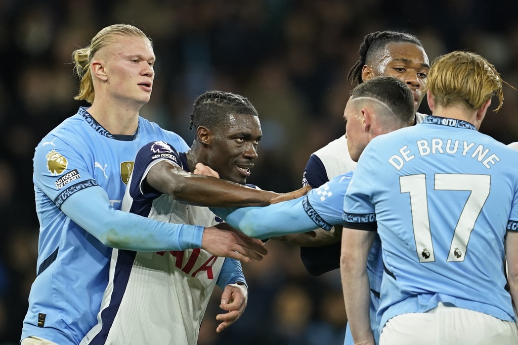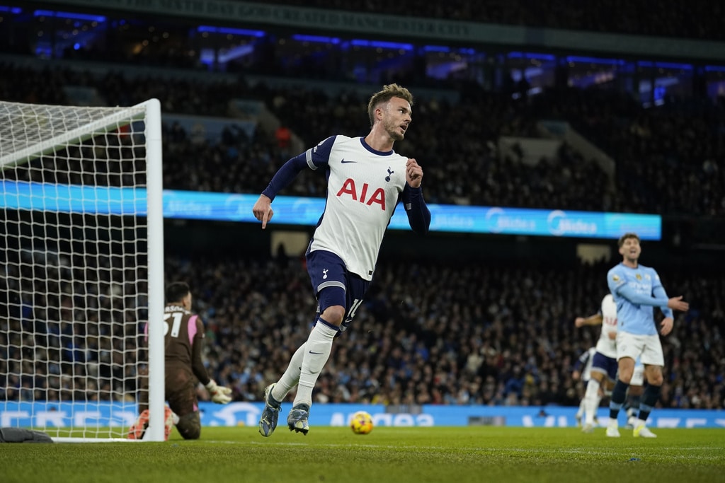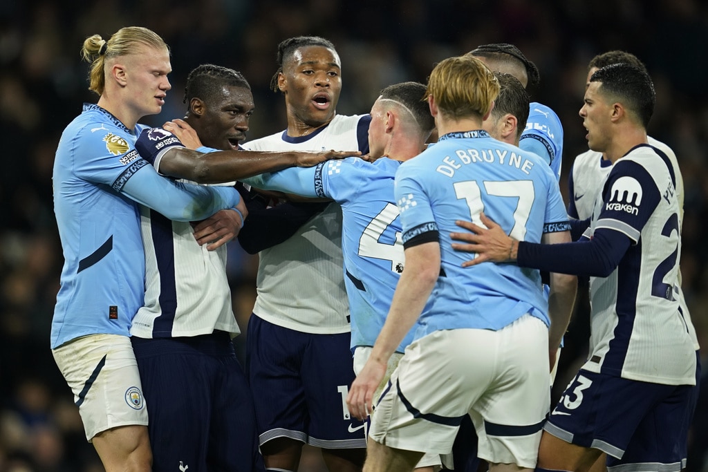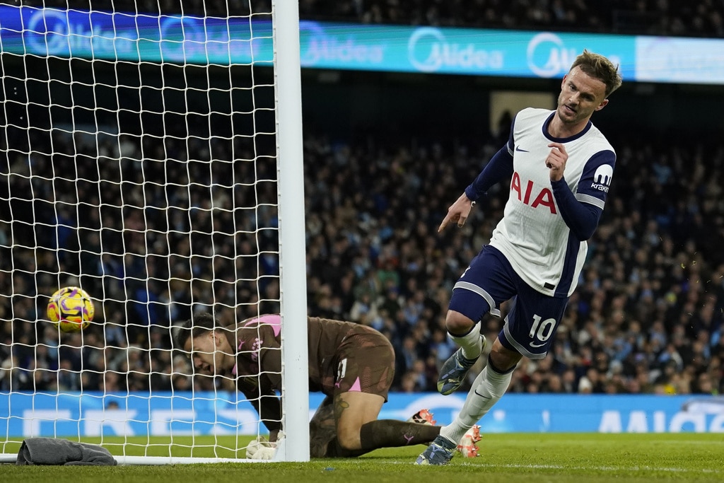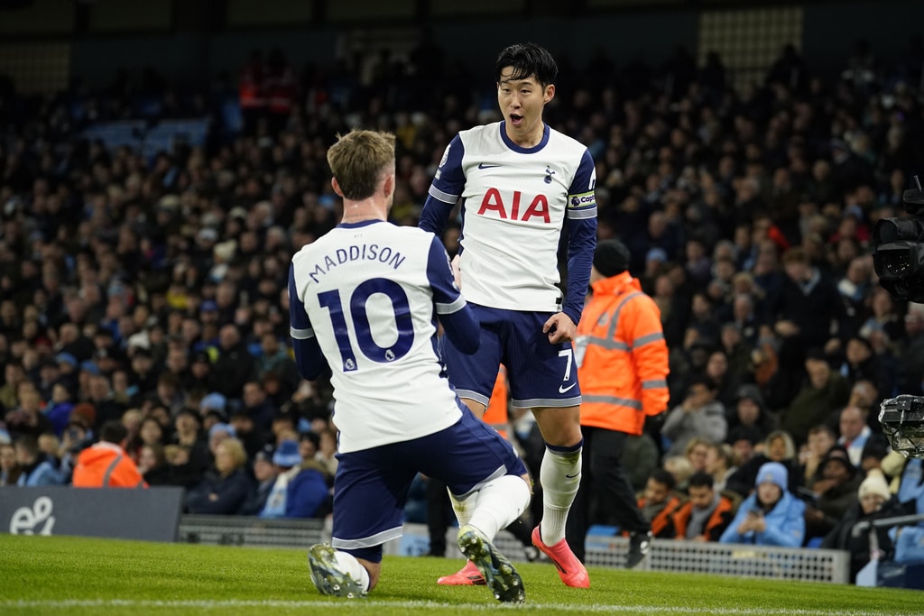 Manchester City’s John Stones, left, is chased by Tottenham’s Son Heung-min during the English Premier League soccer match between Manchester City and Tottenham at the Etihad Stadium in Manchester, England, Sunday, Nov. 24, 2024. (AP Photo/Dave Thompson)Tottenham’s James Maddison scores the opening goal during the English Premier League soccer match between Manchester City and Tottenham at the Etihad Stadium in Manchester, England, Sunday, Nov. 24, 2024. (AP Photo/Dave Thompson)Manchester City’s Erling Haaland, left, holds back Tottenham’s Yves Bissouma as he tussles with Manchester City’s Phil Foden, 4th left during the English Premier League soccer match between Manchester City and Tottenham at the Etihad Stadium in Manchester, England, Sunday, Nov. 24, 2024. (AP Photo/Dave Thompson)Manchester City’s Erling Haaland, left, holds back Tottenham’s Yves Bissouma as he tussles with Manchester City’s Phil Foden, 3rd left during the English Premier League soccer match between Manchester City and Tottenham at the Etihad Stadium in Manchester, England, Sunday, Nov. 24, 2024. (AP Photo/Dave Thompson)Tottenham’s Son Heung-min, right, shoots on goal as Manchester City’s Kyle Walker defends during the English Premier League soccer match between Manchester City and Tottenham at the Etihad Stadium in Manchester, England, Sunday, Nov. 24, 2024. (AP Photo/Dave Thompson)Tottenham’s Pape Matar Sarr, left, challenges for the ball with Manchester City’s Savinho during the English Premier League soccer match between Manchester City and Tottenham at the Etihad Stadium in Manchester, England, Sunday, Nov. 24, 2024. (AP Photo/Dave Thompson)Tottenham’s James Maddison, left, celebrates with Tottenham’s Son Heung-min after scoring his side’s second goal during the English Premier League soccer match between Manchester City and Tottenham at the Etihad Stadium in Manchester, England, Sunday, Nov. 24, 2024. (AP Photo/Dave Thompson)Tottenham’s James Maddison turns after scoring the opening goal during the English Premier League soccer match between Manchester City and Tottenham at the Etihad Stadium in Manchester, England, Sunday, Nov. 24, 2024. (AP Photo/Dave Thompson)