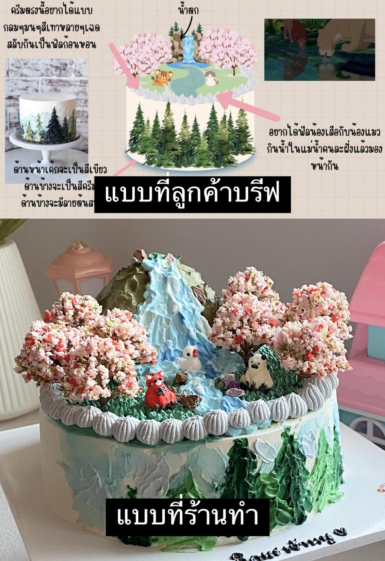 ต้องบอกว่าบรีฟของลูกค้าที่ส่งมาให้ทางร้านนั้นค่อนข้างละเอียด มีทั้ง สีด้านหน้าเป็นสีครีม ด้านหน้าเค้กทำเป็นป่าต้นสนสีเขียว ส่วนด้านบนประดับเป็นดอกซากุระ ที่มีฉากหลังเป็นภูเขาที่มีน้ำตกไหลลงมาเป็นลำธาร โดยแต่ฝั่งของลำธารมีเสือและแมว กำลังดื่มน้ำจากลำธารดังกล่าว