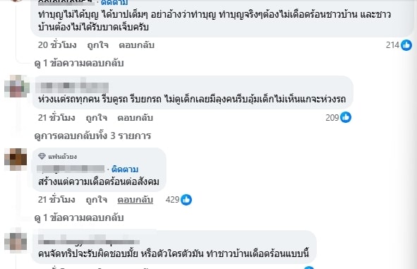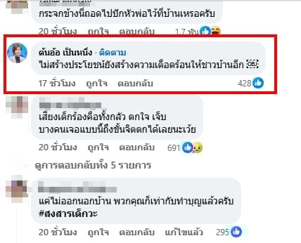 ขณะเดียวกัน ต้นอ้อ เป็นหนึ่ง ก็ได้เข้ามาแสดงความคิดเห็นใต้คลิปดังกล่าวด้วย โดยบอกว่า “ไม่สร้างประโยชน์ยังสร้างความเดือดร้อนให้ชาวบ้านอีก” นอกจากนั้นชาวเน็ตคนอื่น ๆ ก็เห็นด้วยกับที่ต้นอ้อพูด ทั้งยังบอกว่าคนที่ชนเป็นสมาชิกแก๊งน้ำไม่อาบ ห่วงแต่รถ ไม่ห่วงเด็กน้อยที่ร้องเลย แค่ไม่ออกจากบ้านมาสร้างความเดือดร้อนให้คนอื่นก็ถือเป็นการทำบุญแล้ว