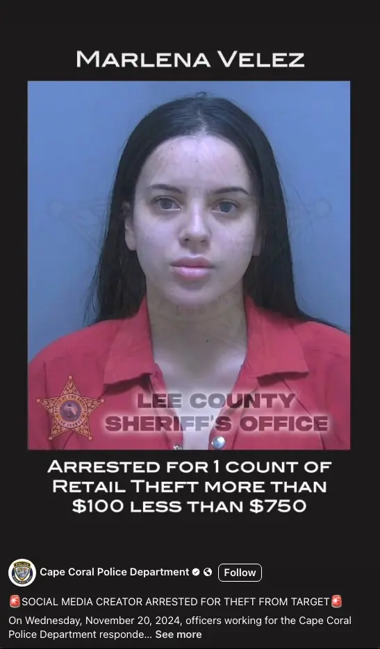 มาร์ลีนา เวเลซ วัย 22 ปี ดาวติ๊กต็อกที่มียอดผู้ติดตามมากกว่า 3 แสนคน โดนแจ้งข้อหาลักทรัพย์ หลังถูกกล่าวหาว่าขโมยของจากร้าน Target สาขาเคป คอรัล มูลค่ากว่า 500 ดอลลาร์ (ประมาณ 17,313 บาท) เมื่อวันที่ 30 ตุลาคมที่ผ่านมา ตามรายงานของสื่อท้องถิ่น Fort Myers News-Press