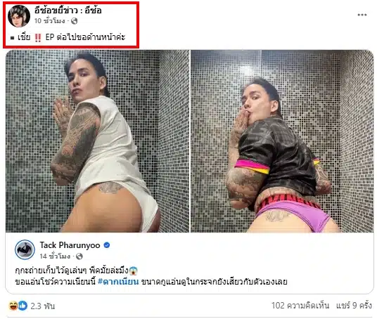 งานนี้ทำเอาแฟนคลับทั้งชายหญิงแห่กันเข้ามากดไลก์ กดแชร์กันสนั่นหวั่นไหวกว่า 2.5 หมื่นคน แถมเพจดัง อีซ้อขยี้ข่าว : อีซ้อ ถึงกับทนไม่ไหวกับความเซ็กซี่ยั่วยวนนี้ต้องเข้าคอมเมนต์ท้าทายระบบว่า “คนจริง ต้องโชว์…ค่ะ” นอกจากนั้นก็ยังแชร์โพสต์ดังกล่าวไปที่เพจของตัวเองด้วยพร้อมบอกว่ารอดู EP. ต่อไปข้างหน้า บอกเลยว่าแค่รูปก้นของหนุ่มแทค ก็ทำชาวบ้านชาวช่องเสียวกันทั้งประเทศแล้ว