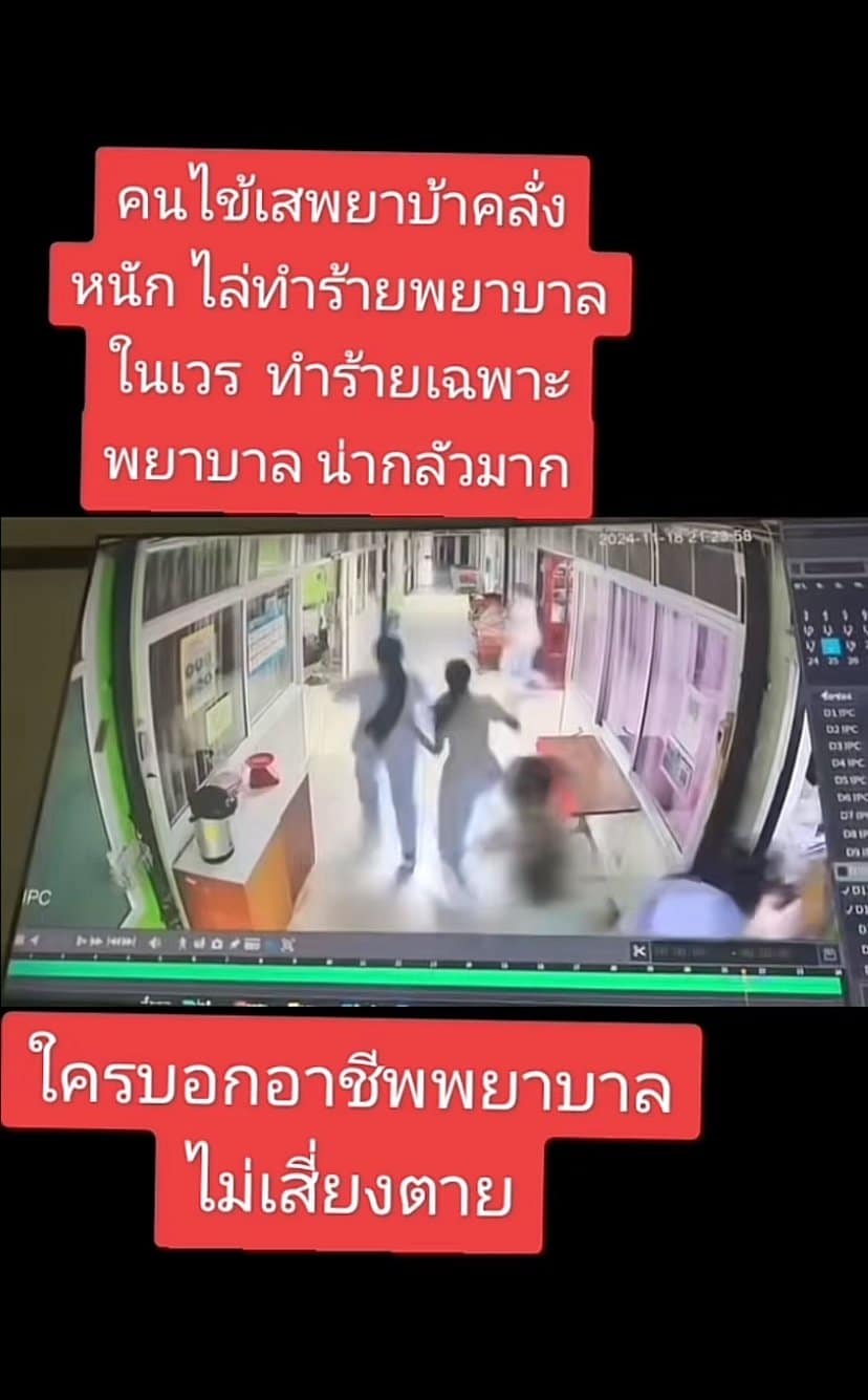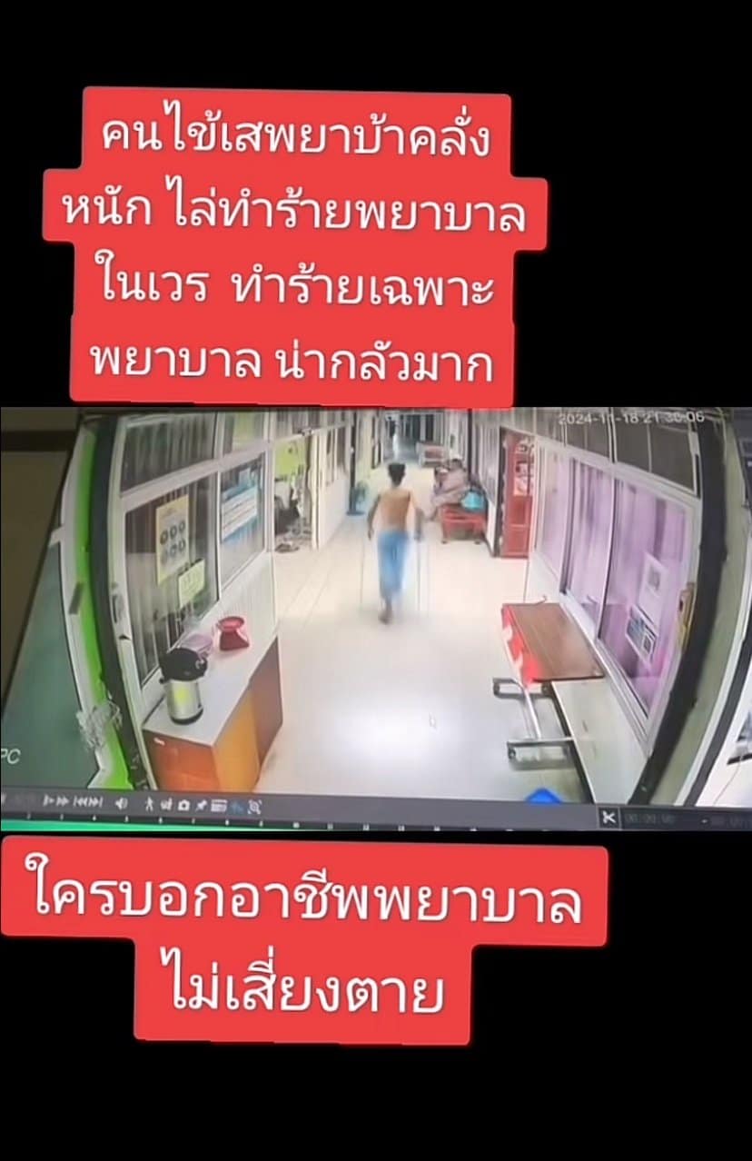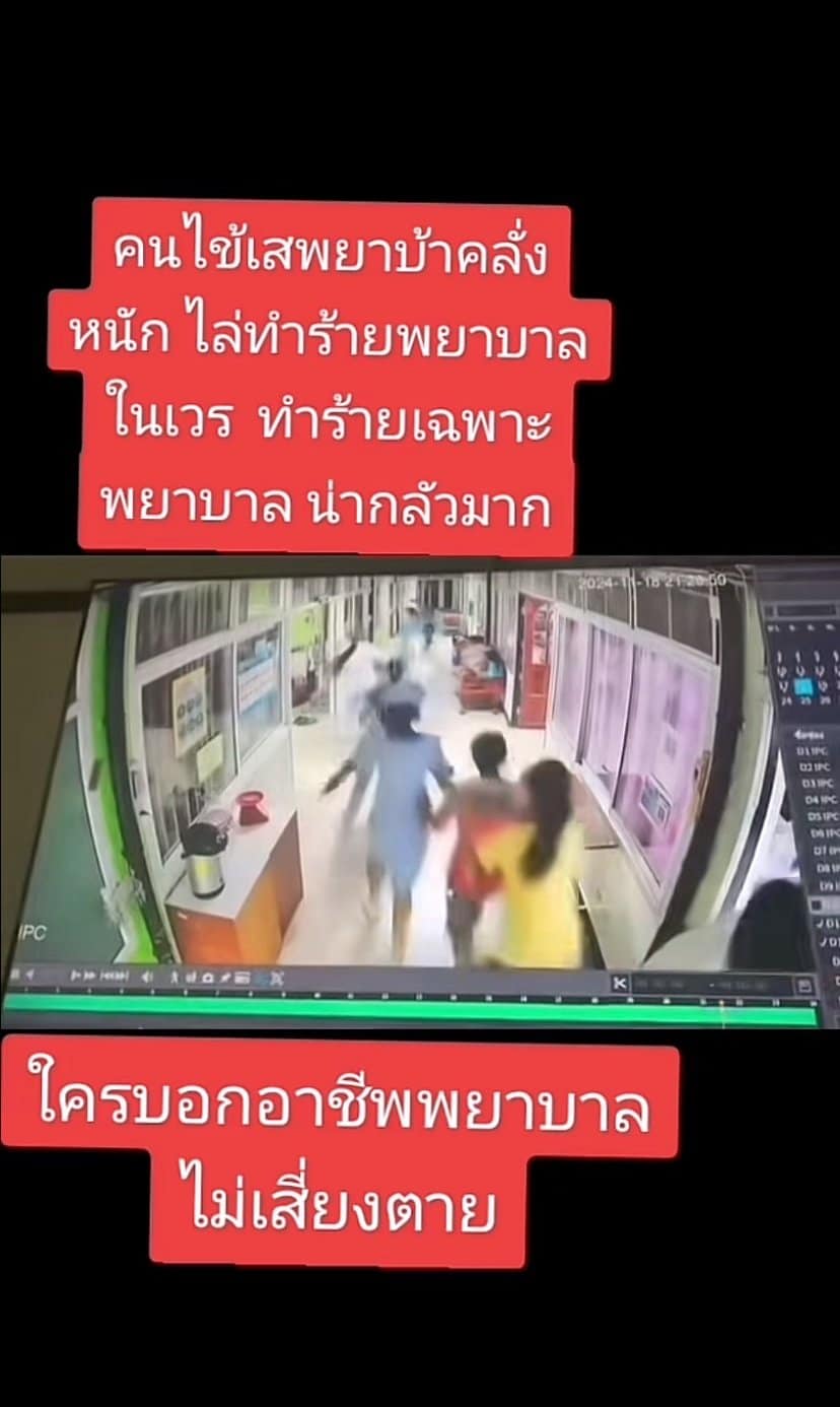 ในคลิปเผยให้เห็นนาทีที่กลุ่มพยาบาลประมาณ 5-6 คนวิ่งกรูแย่งกันออกมาจากห้องด้วยท่าทีที่แตกตื่นตกใจ วิ่งกันแบบหนีตายไม่คิดชีวิตไปตามทางเดินจนสุดมุมกล้อง หลังจากนั้นไม่กี่วิก็มีคนไข้ผู้ชายไม่ใส่เสื้อ ใส่แต่กางเกงของโรงพยาบาล เปิดประตูเดินตามออกมา ในมือข้างขวาถือท่อนเหล็กกั้นเตียงเอาไว้ ก่อนจะวิ่งไล่ตามกลุ่มพยาบาลที่หนีออกมาก่อนหน้านี้ไป โดยที่ไม่ได้สนใจญาติคนไข้คนอื่น ๆ ที่นั่งอยู่ในบริเวณนั้น คล้ายกับว่าพุ่งเป้าไปที่พยาบาลอย่างเดียว